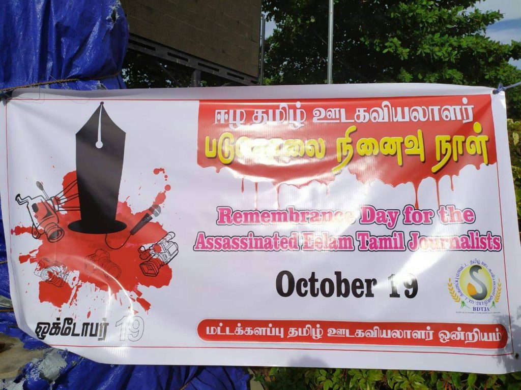 ஈழத் தமிழ் ஊடகவியலாளர் படுகொலை நினைவு தின நிகழ்வு கடந்த(19.10.2019) பிற்பகல் 3.மணியளவில் மட்டக்களப்பு காந்தி பூங்காவிற்கு முன்னால் அமைக்கப்பட்டுவரும் படுகொலை செய்யப்பட்ட ஊடகவியலாளர்களுக்கான நினைவு தூபியின் அருகில் அனுஷ்டிக்கப்பட்டது.