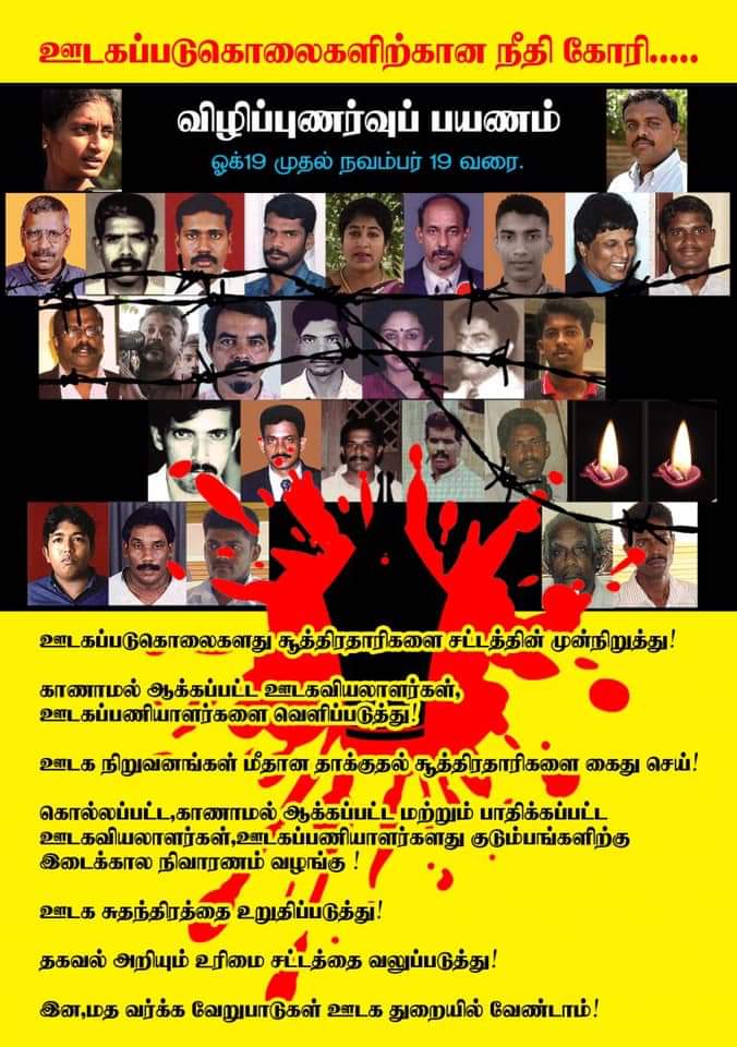 ஊடகவியலாளர் நிமலராஜன் படுகொலை செய்யப்பட்ட ஒக்டோபர் 19 முதல் நவம்பர் 19 வரையிலான ஒரு மாத காலம் ஊடகப் படுகொலைகள், காணாமல் ஆக்குதல்கள், அச்சுறுத்தல்களுக்கு எதிராக நீதி கோரி பயணிக்கும் காலமாக பிரகடனப்படுத்தப்பட்டுள்ளது.
