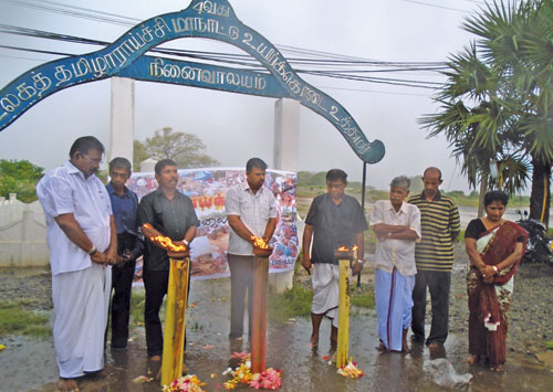 தமிழாராச்சி 4124451 கொட்டும் மழைக்கும் மத்தியில் முற்றவெளியிலுள்ள தமிழராய்ச்சி மாநாட்டில் படுகொலை செய்யப்பட்டவர்களது நினைவுதூபி முன்னதாக முள்ளிவாய்க்கால் நினைவேந்தலில் இன அழிப்பிற்கு உள்ளானவர்களிற்கு அஞ்சலி செலுத்தப்பட்டுள்ளது.