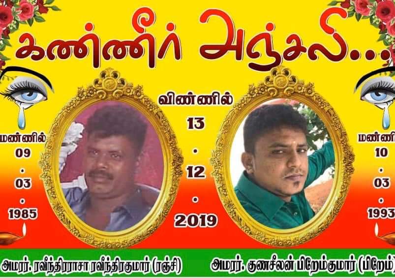 வடமராட்சி கிழக்கு மாமுனையைச் சேர்ந்த குணசீலன் பிரேம்குமார் (பிறேம் – வயது 26) மற்றும் ரவீந்திரராசா ரவீந்திரகுமார் (ரஞ்சி – வயது 34) ஆகிய இரு இளைஞர்களே விபத்தில் உயிரிழந்துள்ளார்கள்.