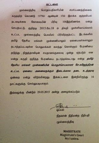 நீதிமன்ற தடை தொடர்பினில் பொன்னம்பலம் கஜேந்திரகுமார் தெரிவிக்கையினில் கடந்த 11 ம் திகதி திங்கட்கிழமை நிகழ்வு தொடர்பான அனுமதி கோரி எம்மால் முல்லைதீவு காவல் நிலையத்தினில் விண்ணப்பிக்கப்பட்டிருந்தது.இந்நிலையினில் முல்லைதீவு நீதவான் நீதிமன்றம் தடை பெற்று அதனை பொலிஸார் இன்று ஒப்படைத்துள்ளனர் என அவர் தெரிவித்தார்.