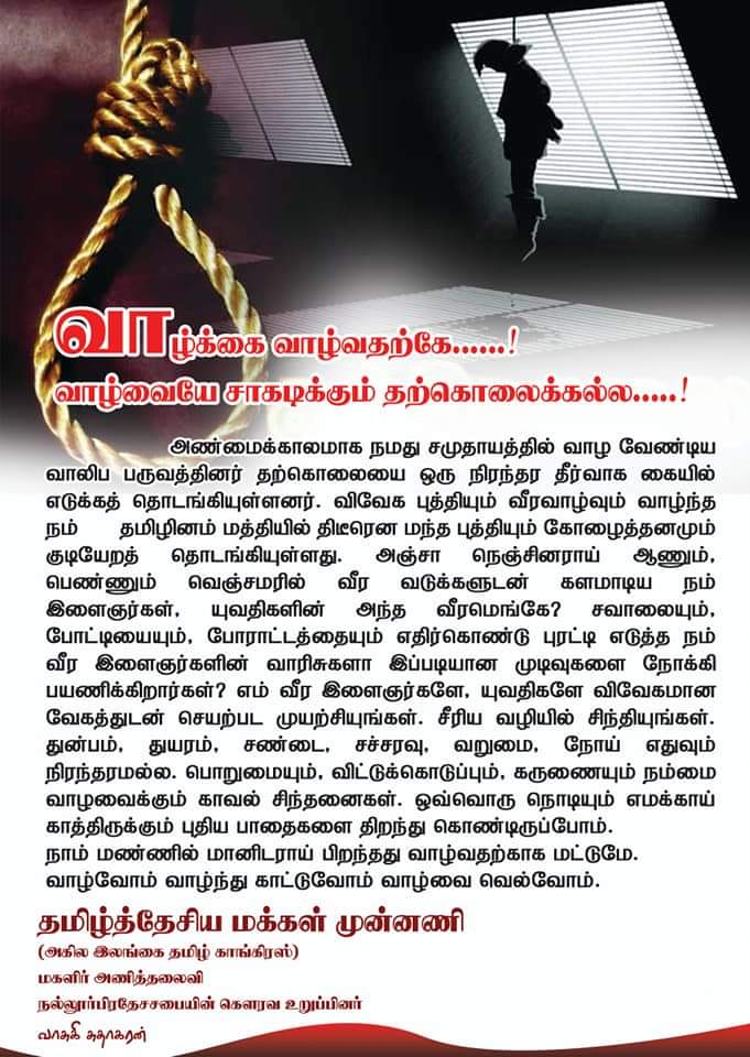 வாசுகி சுதாகரன் அண்மைக்காலமாக தமிழர் தாயகத்தில் அதிகரித்து வரும் தற்கொலை தொடர்பான விழிப்புணர்வு நடவடிக்கையில் ஈடுபட்டார். இது தொடர்பான துண்டுப்பிரசுரங்களும் விநியோகிக்கப்பட்டது.