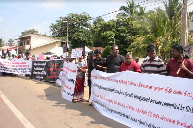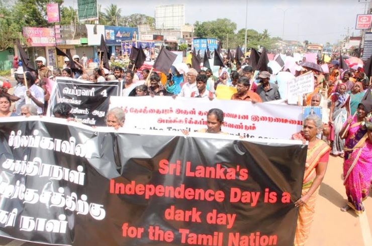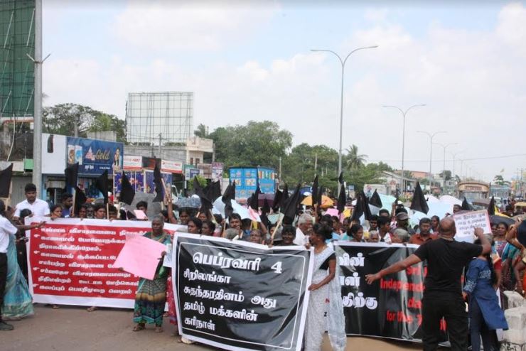 காணாமல் ஆக்கப்பட்டவர்களுக்கு நீதி மறுக்கப்பட்ட நாட்டில் சுந்திர தினம் எதற்கு, பதில் கூறு பதில் கூறு காணாமல் ஆக்கப்பட்ட உறவுக்களுக்கு பதில் கூறு? சர்வதேச நீதி மன்றில் இலங்கை அரசை நிறுத்து, எங்களுக்கு சர்வதேச விசாரணையே தேவை போன்ற வாசகங்கள் எழுதப்பட்ட பதாதைகளுடன் பாராளுமன்ற உறுப்பினர் சி. சிறிதரன், முன்னாள் வடக்கு மாகாண கல்வி அமைச்சர் த.குருகுலராஜா மற்றும் கிளிநெச்சி தமிழரசு கட்சியினர் கலந்துகொண்ட தரப்பினர் ஒரு புறமாக போராட்டத்தல் கந்தசுவாமி கோவில் நின்றபடி போராட்டத்தில் ஈடுப்பட்டனர்.