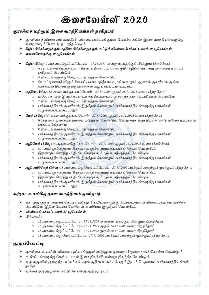 பிரான்சு தமிழர் ஒருங்கிணைப்பு குழு தமிழர் கலை பண்பாட்டுக்கழகம் வருடாந்தம் நடாத்தும் இசைவேள்வி – 2020 போட்டி விண்ணப்பங்கள் கோரப்பட்டுள்ளன.