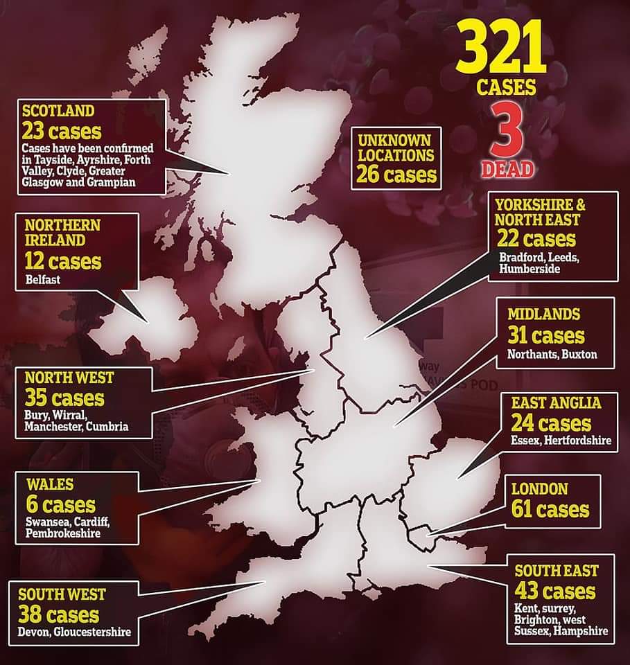 பிரித்தானியாவில் மேலும் 46 புதிய கொரோனா வைரஸ் நோயாளிகள் இனங்காணப்பதையடுத்து பாதிப்புக்குள்ளானவர்களின் எண்ணிக்கை 319 ஆக உயர்ந்துள்ளது.இரண்டு நபர்களுக்கு கொரோனா வைரஸ் இருப்பதை வேல்ஸ் சுகாதாரத்துறை உறுதிப்படுத்தியுள்ளது. அவர்கள் இருவரும் அண்மையில் இத்தாலிக்குச் சென்று திரும்பி வந்ததவர்கள் என்று கூறப்படுகின்றது.