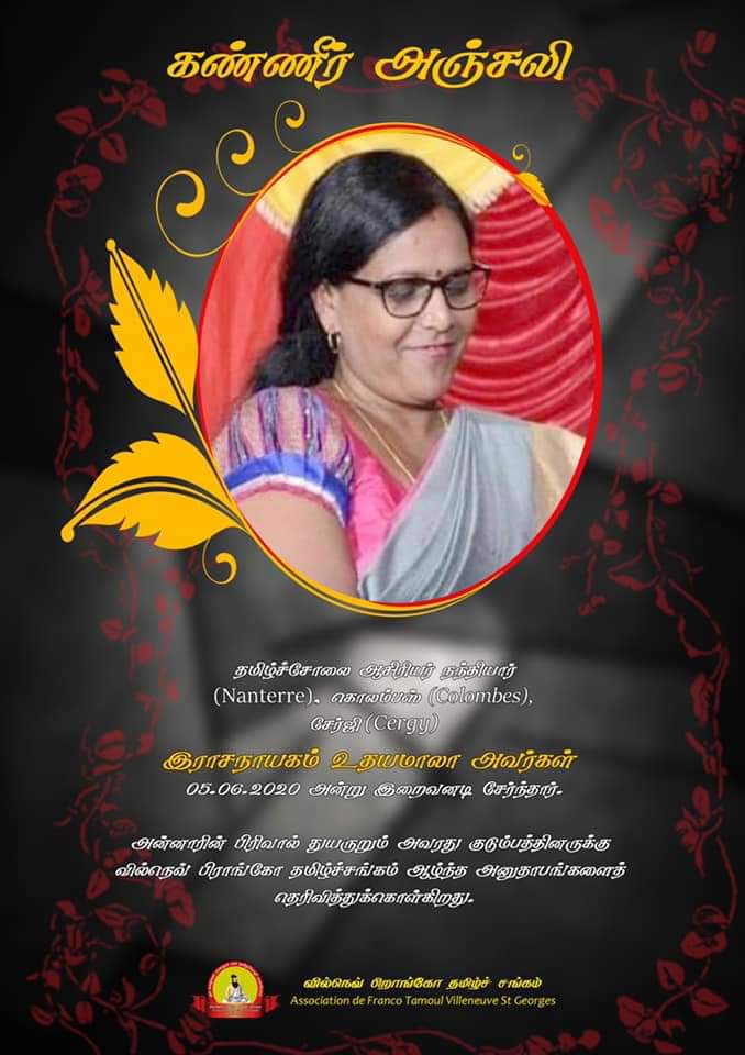 பிரான்சில் தமிழ்ச் சோலைப் பள்ளிகளின் ஆசிரியை இ உதயமாலா அவர்களின் மறைவுகுறித்து மேலும் பல தமிழ்ச்சங்கங்கள் தமது இரங்கலைத் தெரிவித்துள்ளன.