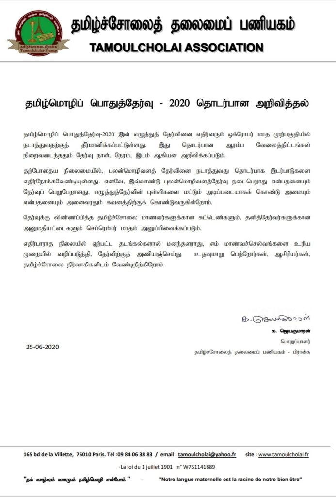 எதிர்பாராத நிலையில் ஏற்பட்ட தடங்கல்களால் மனந்தளராது, எம் மாணவச் செல்வங்களை உரிய முறையில் வழிப்படுத்தி, தேர்விற்கு அணியஞ்செய்து உதவுமாறு பெற்றோர்கள், ஆசிரியர்கள், தமிழ்ச்சோலை நிர்வாகிகளிடம் வேண்டிநிற்கிறோம்.
