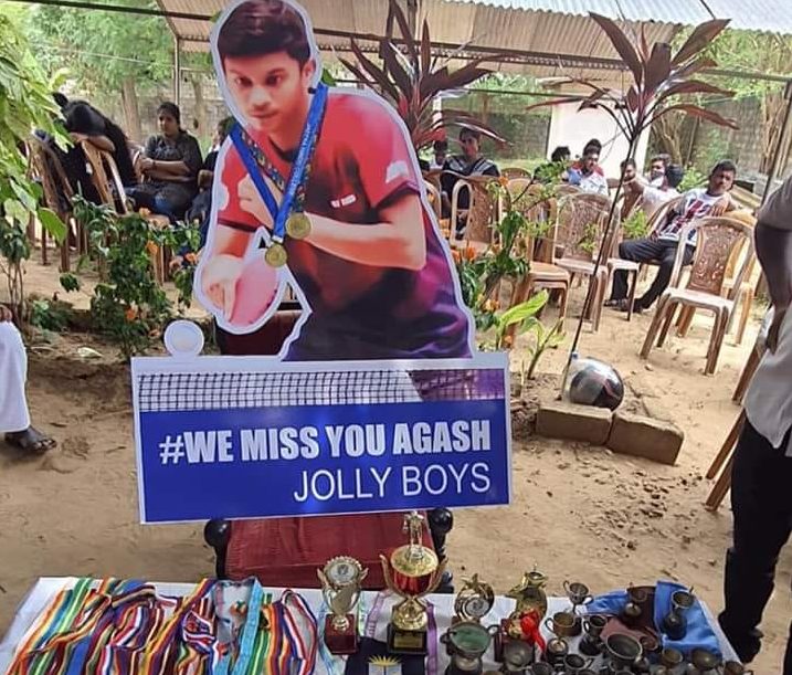 விளையாட்டில் ஆர்வமுள்ள அந்த மாணவனின் உருவப்படத்தை தயார் செய்து, அவர் விளையாட்டில் பெற்ற பரிசில்களை அதன் முன் காட்சிப்படுத்தியுள்ளனர் பல்கலைக்கழக நண்பர்கள்.