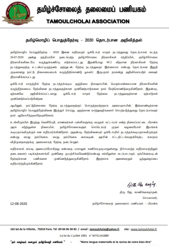 ஒக்டோபர் மாதத்தில் தேர்வு நடாத்தக்கூடிய சூழ்நிலை நிலவுமாயின், பெரும்பான்மையான நிர்வாகிகளின் கருத்திற்கமைய தேர்வினை நடாத்துவதற்கான முன்னேற்பாடுகளை நாம் மேற்கொண்டுவருகின்றோம். இதன்படி, ஏற்கனவே அறிவிக்கப்பட்டவாறு ஒக்டோபர் மாதம் தேர்வை நடாத்துவதற்கான ஏற்பாடுகள் முன்னெடுக்கப்படுகின்றன. ஆயினும், நாட்டுநிலைமை தேர்வு நடாத்துவதற்குப் பொருத்தமற்றதாக அமையுமாயின், இவ்வாண்டிற்கான தமிழ்மொழிப் பொதுத்தேர்வினை இரத்துச் செய்து, அதற்கான மாற்றுவழிகளைச் செயற்படுத்துவது தொடர்பாகவும் நாம் ஆலோசித்தவாறேயுள்ளோம். உள்ளிருப்பில் இருந்து வெளியேறி, மாணவர்கள் பள்ளிகளுக்கு வருதல் கட்டாயம் என்ற நிலைப்பாட்டை பிரான்சு அரசு எடுத்துள்ள நிலையில்,தமிழ்ச்சோலைகளும் செப்டெம்பர் முதல் வழமைபோல் இயங்கக் கூடியதாகவிருக்கும் என எதிர்பார்க்கின்றோம். அதன்படி, தேர்வினையும் ஒக்டோபரில் நடாத்தக்கூடியதாகவிருக்கும் என்பது எமது நம்பிக்கை. எமது நம்பிக்கை கைகூடின், அரசின் சட்டதிட்டங்களுக்கேற்ப, சுகாதார விதிமுறைகளுக்கு அமைவாகத் தேர்வு நடைபெறும்.