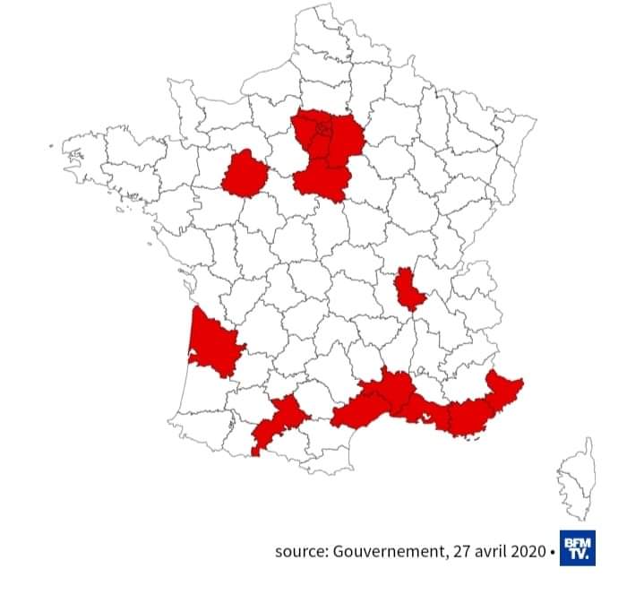 பாரிஸ் நகரம் மற்றும் Bouches-du-Rhône ஆகிய பகுதிகளும் Seine-Saint-Denis, Val-de-Marne, Hauts-de-Seine, Seine-et-Marne, Essonne, Val-d’Oise, Yvelines, Sarthe, Rhône, Gironde, Haute-Garonne, Hérault, Gard, Var and Alpes-Maritimes, Guadeloupe, Martinique Guyana ஆகியனவுமே சிவப்பு வலயங்களாக அறிவிக்கப்பட்டுள்ளன.