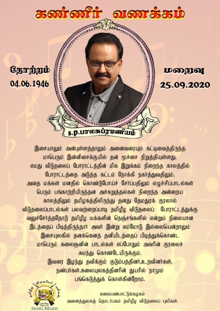 இனிய குரலால் கோடானகோடி மக்களின் மனதை கட்டிப்போட்ட எஸ்.பி. பாலசுப்பிரமணியம் அவர்களின் மறைவு இசை உலகுக்கு அல்லாமல் தமிழ்பேசும் மக்களுக்கும் பேரிழப்பாகும். தமிழீழ விடுதலைப்போரிலும் தனது இசை குரலால் வலுச்சேர்த்தவர் எஸ்.பி.பாலசுப்பிரமணியம் அவர்கள். அவரின் மறைவுக்கு தமிழீழ விடுதலைப் புலிகளின் அனைத்துலகத் தொடர்பகம் தங்கள் கண்ணீர் வணக்கத்தைத் தெரிவித்துக்கொள்கின்றது.,