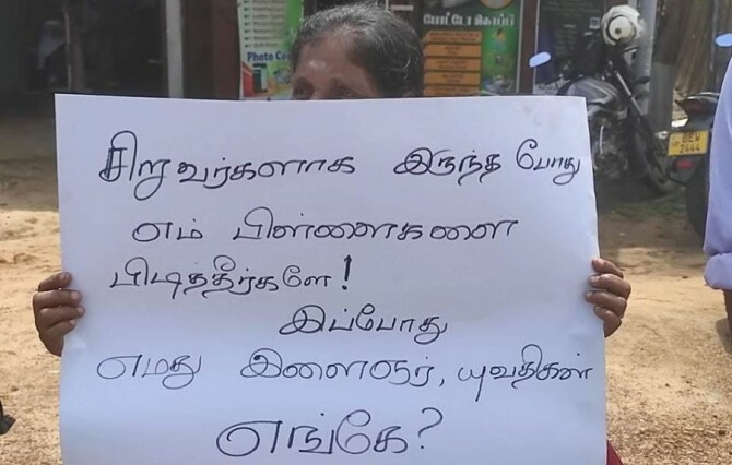 முல்லைத்தீவு மாங்குளம் வீதியில் அமைந்திருக்கின்ற வலிந்து காணாமல் ஆக்கப்பட்டவர்களின் உறவினர்களின் சங்க கட்டிடத்துக்கு முன்பாக இன்று காலை 10 மணி முதல் சுமார் ஒரு மணித்தியாலம் இந்த போராட்டம் இடம்பெற்றிருந்தமை குறிப்பிடத்தக்கது.