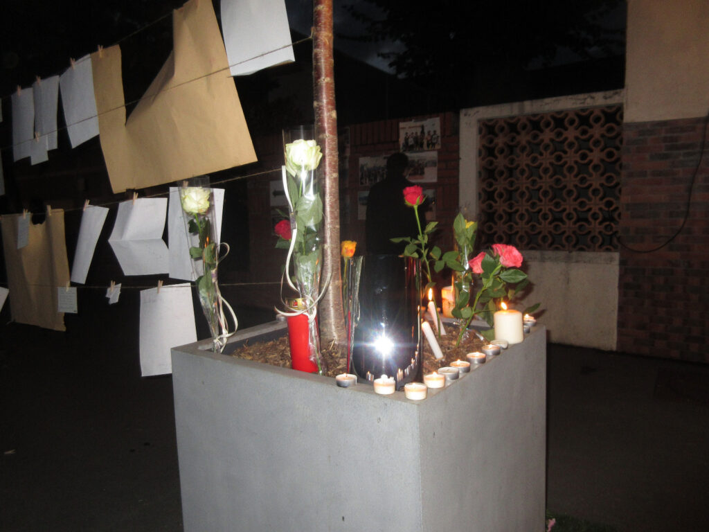 உள்ளே மைதானத்தில் இறந்தவர்களின் படங்களும், பள்ளியில் படிக்கும் போது அவர்கள் எடுத்துக்கொண்ட படங்கள், விளையாட்டு உடைகள் சுவர்களின் ஒட்டப்பட்டு இருந்தன. வந்தவர்கள் யாவரும் அவர்கள் நினைவாகவும், ஆறுதல் தரும் கருத்துக்களையும் எழுதி மெழுகுதிரிகள் பல நூறு ஏற்றிவைத்தனர். எங்கும் அமைதியான நிசப்தமும், கவலையுடனும், வேதனையுடன் இருந்தனர்.