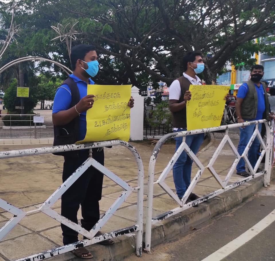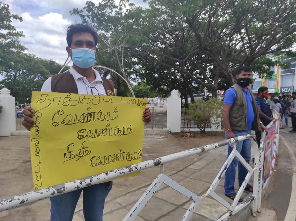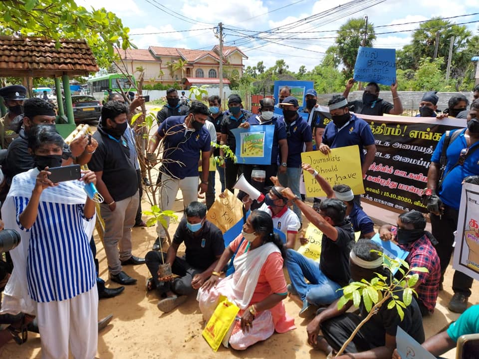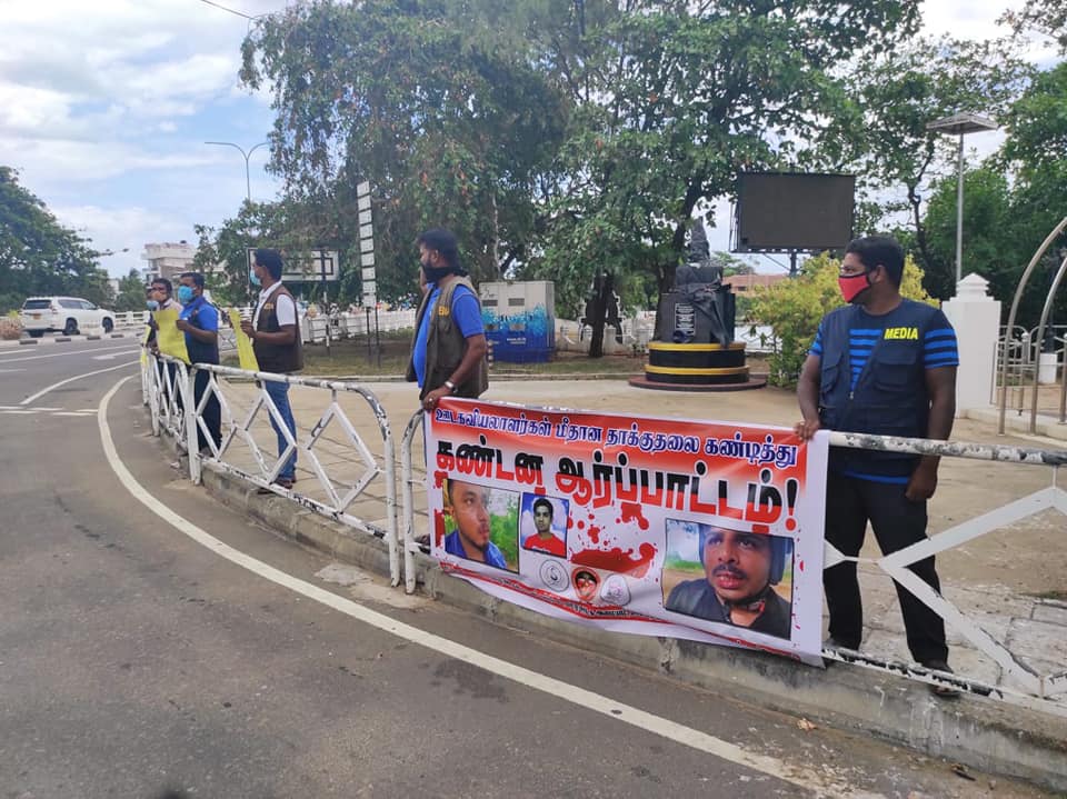 முல்லைத்தீவு மாவட்ட ஊடகவியலாளர்கள் இருவர் மீதான தாக்குதலை கண்டித்து இன்று (15.10.2020) மதியம் 12 மணிக்கு காந்தி பூங்காவிற்கு முன் சுகாதார நடைமுறைகளை பின்பற்றி கண்டன ஆர்ப்பாட்டம் ஒன்று நடைபெற்றது.