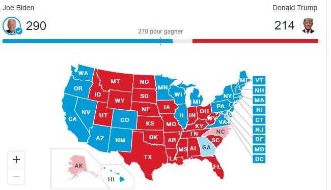 இதையடுத்து, பெரும்பான்மைக்கு 270 தேர்தல் சபை வாக்குகள் தேவையாகவுள்ள நிலையில், ஜோ பைடன் 290 வாக்குகளைப் பெற்றுள்ளார். இந்த வெற்றியின் மூலம் அமெரிக்காவின் 46ஆவது ஜனாதிபதியாக ஜோ பைடன் தெரிவாகியுள்ளார்.