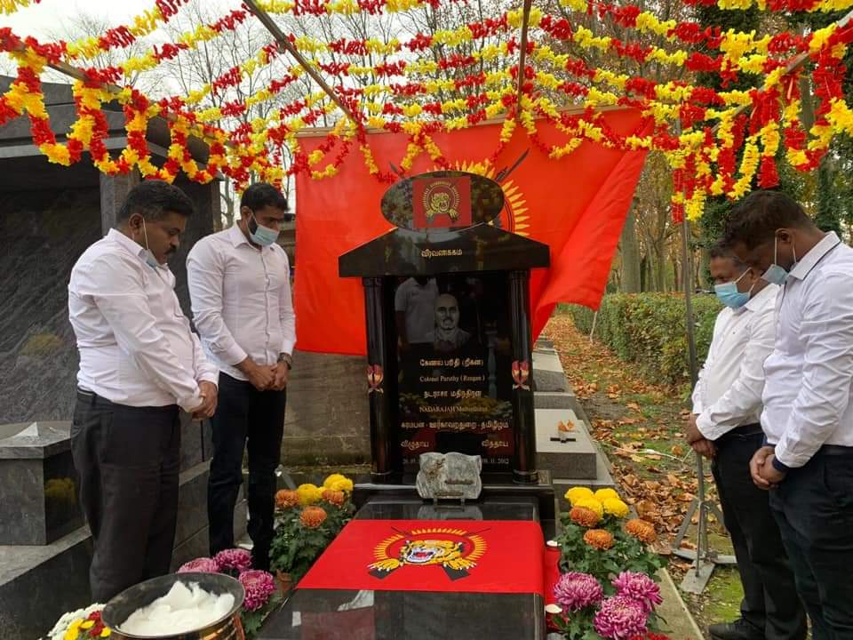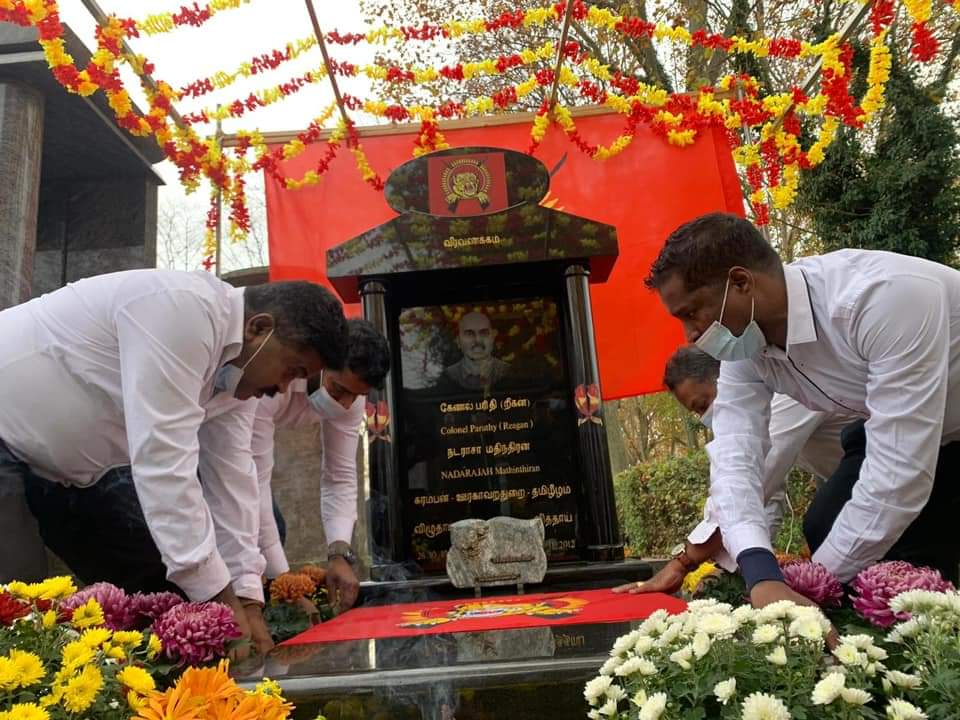 பிரான்சு பாரிசில் 08.11.2012 அன்று படுகொலை செய்யப்பட்ட தமிழர் ஒருங்கிணைப்புக் குழு – பிரான்சின் பொறுப்பாளர் கேணல் பரிதி அவர்களின் 8 ஆம் ஆண்டு வணக்க நிகழ்வு இன்று (08.11.2020) ஞாயிற்றுக்கிழமை காலை 9.00 மணிக்கு அவர் படுகொலை செய்யப்பட்ட இடத்தில் மலர்வணக்கமும், சுடர்வணக்கமும் இடம்பெற்றது. தொடர்ந்து கேணல் பரிதி அவர்களின் வித்துடல் விதைக்கப்பட்டுள்ள பந்தன் கல்லறையில் பகல் 11.00 மணிக்கு நினைவு வணக்க நிகழ்வு இடம்பெற்றது. பிரான்சு தமிழர் ஒருங்கிணைப்புக்குழு – மாவீரர் பணிமனையின் ஏற்பாட்டில் பிரான்சு அரசின் கொரோனா சட்ட திட்டங்களுக்கு அமைவாக இடம்பெற்ற இந்நிகழ்வின் ஆரம்ப நிகழ்வாக கேணல் பரிதி அவர்களின் கல்லறைமீது தமிழீழத் தேசியக்கொடி போர்த்தி மதிப்பளிப்புச்செய்யப்பட்டது. இந்நிகழ்வில் பொதுச்சுடரினை பிரான்சு தமிழர் ஒருங்கிணைப்புக் குழு மாவீரர் பணிமனைப் பொறுப்பாளர் திரு.நிதர்சன் அவர்கள் ஏற்றி வைத்தார். ஈகைச் சுடரினை கேணல் பரிதி அவர்களின் தாயார் ஏற்றிவைக்க கல்லறைக்கான மலர் மாலையினை கேணல் பரிதியில் துணைவியார் அணிவித்து மலர்வணக்கம் செலுத்தினார். அகவணக்கத்தைத் தொடர்ந்து நிகழ்வில் கலந்துகொண்ட அனைவரும் மலர் வணக்கம் செலுத்தி, சுடர் வணக்கம் செய்தனர். தொடர்ந்து