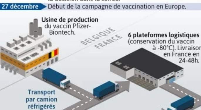 (படம் :பெல்ஜியத்தில் இருந்து பிரான்ஸுக்கு தடுப்பூசி எடுத்துவரப்படும் வழிமுறைகளை விளக்கும் Infographie Visactu வரைபடம்)