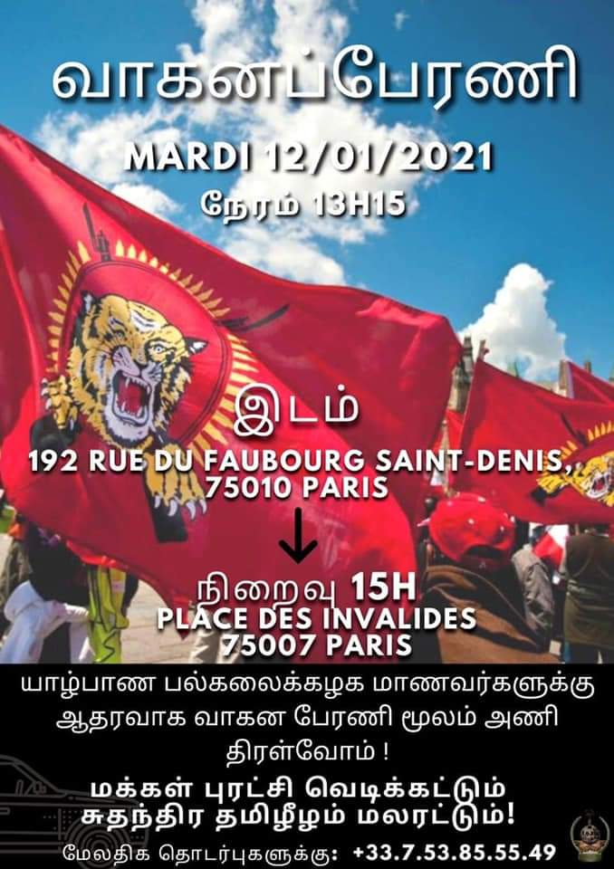 யாழ். பல்கலைக்கழக முற்றத்தில் அமைக்கப் பெற்றிருந்த முள்ளிவாய்க்கால் நினைவுத்தூபி இடித்தழிப்பு செய்யப்பட்டதைக் கண்டித்து பல்கலை மாணவர்களுக்கு ஆதரவாக பிரான்சில் தமிழ் இளையோர்களின் ஏற்பாட்டில் வாகனப்பேரணி ஒன்று நாளை செவ்வாய்க்கிழமை இடம்பெறவுள்ளது.