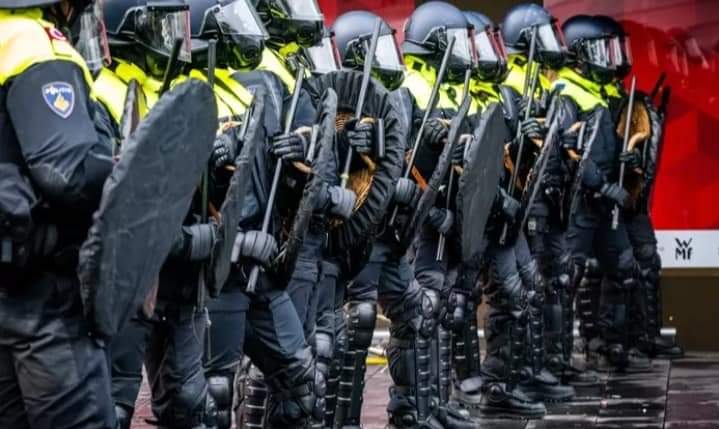 அம்ஸ்ரடாமில் நாய்கள், குதிரைகள் சகிதம் கலகம் அடக்கும் பொலீஸார் ஆர்ப்பாட்டக்காரர்களை விரட்டினர்.