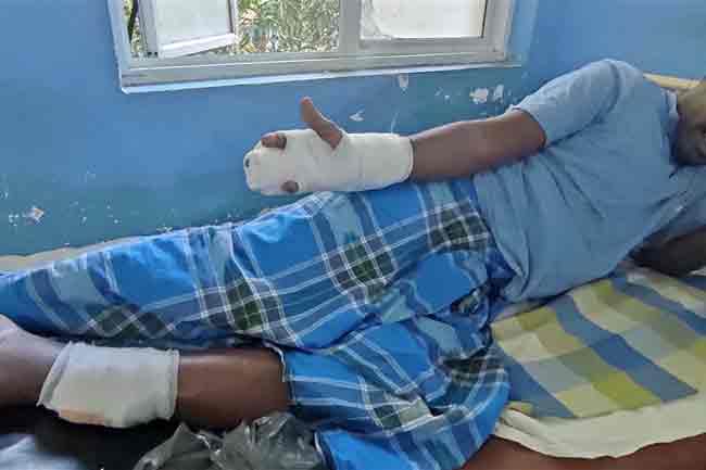 புதுக்குடியிருப்பு, கோம்பாவிலைச் சேர்ந்த 39 வயதுடைய இரண்டு பிள்ளைகளின் தந்தையே இவ்வாறு கைவிரல் ஒன்று முறிந்த நிலையிலும் காலிலும், கையிலும் கரடியின் கடிகாயங்களுக்கு உள்ளான நிலையிலும் வைத்தியசாலையில் சிகிச்சைக்காக அனுமதிக்கப்பட்டுள்ளார்.