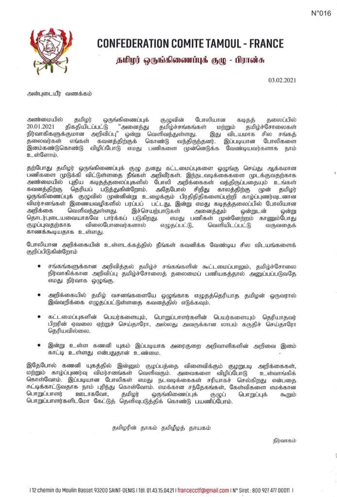 அண்மையில் பிரான்சு தமிழர் ஒருங்கிணைப்புக் குழுவின் போலியான கடிதத் தலைப்பில் 20.01.2021 திகதியிடப்பட்டு ‘அனைத்து தமிழ்ச்சங்கங்கள் மற்றும் தமிழ்ச்சோலைகள் நிர்வாகிகளுக்குமான அறிவிப்பு” ஒன்று வெளிவந்துள்ளது.