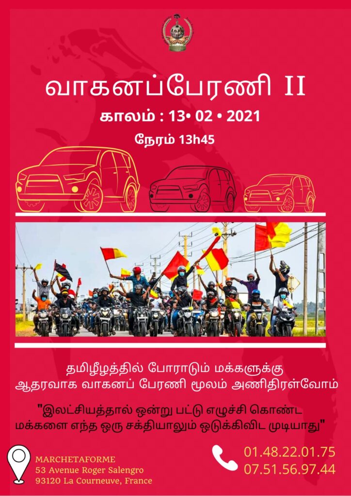 SOUTIEN AU MOUVEMENT #P2PRassemblons nous en soutien à la marche du peuple Tamoul au Sri Lanka, de Pottuvil à Polikandi. Faisons résonner leur voix ici, en France. Unissons nous pour que la voix de notre peuple soit entendue au niveau international.Des rassemblements sont prévus à la Chapelle les mercredis : 10 février / 17 février / 24 février de 14h45 à 16h45Pour plus d’information, veuillez contactezCCTF : 01.48.22.01.75TYO France : 07.51.56.97.44 / 07.53.85.55.49MTE : 06.52.72.58.67Cordialement,TYO FranceMaison du Tamil Eelam Franceபொத்துவில் முதல் பொலிகண்டி #P2P முடிவல்ல – தொடர்ச்சி ! உலகெங்கும் வாழும் தமிழர்கள் நாம் ஒன்று சேர்ந்து உரிமை குரல் கொடுப்போம்.மாபெரும் ஒன்றுகூடல் ஒவ்வொரு புதன் : 10 Février – 17 Février -24 Févrierஇடம்: La Chapelleநேரம் : 14h45-16h45தொடர்புகளுக்கு : TYO : 07.51.56.97.44 – 07.53.85.55.49 / MTE : 06.52.72.58.67தகவல் : தமிழ் இளையோர் அமைப்பு – பிரான்சு / தமிழீழ மக்கள் பேரவை பிரான்சுமேலதிக தொடர்புகளுக்கு :CCTF : 01.48.22.01.75