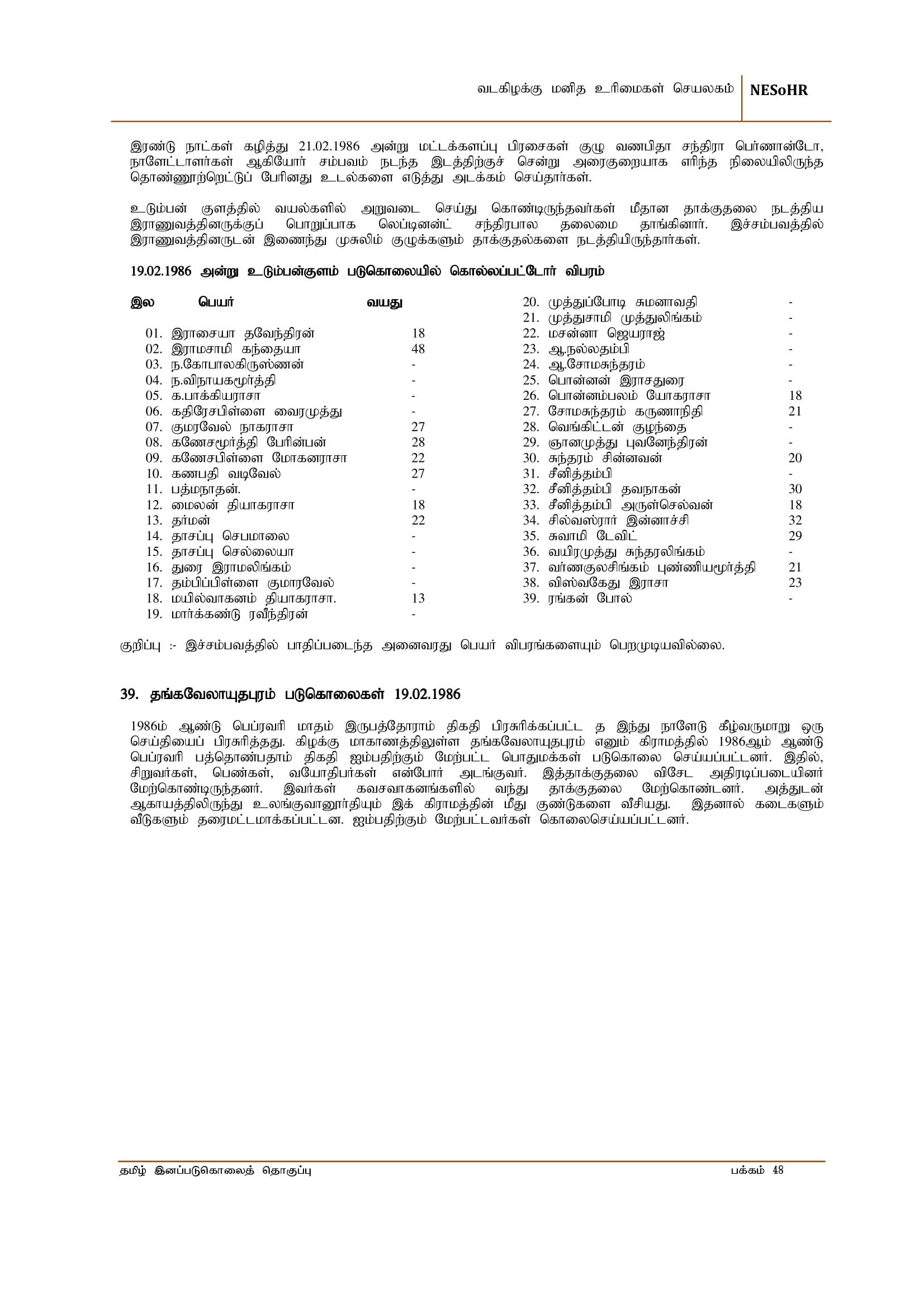 19-02-1986 அன்று இன்றைய நாளில் உடும்பன் குளப்பகுதியில் 120 இற்கும் மேற்பட்ட அப்பாவி தமிழர்களை படுகொலை செய்த 36ஆவது மறக்க முடியாத நினைவு நாள் இலங்கை தமிழர்கள் வரலாற்றில் கிழக்குமாகாணத்திலும் சிறீலங்கா இராணுவத்தினால் கொடூரமான முறையில் கூடுதலான இனப்படுகொலைகள் நடந்திருக்கின்றன.