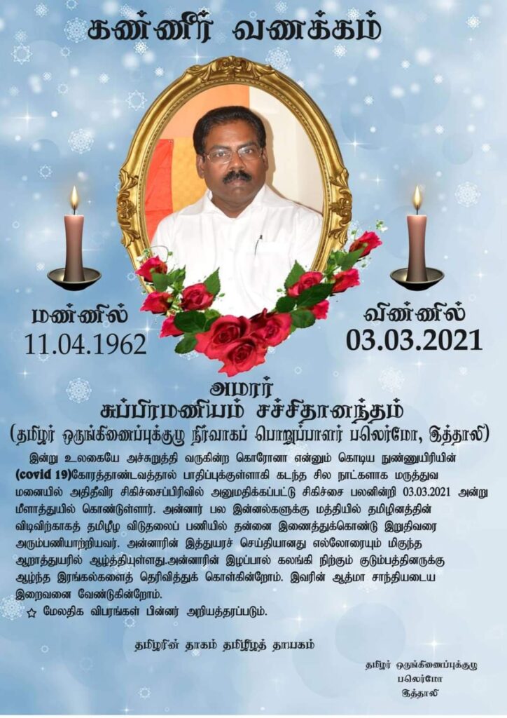இத்தாலி பலர்மோ தமிழர் ஒருங்கிணைப்பு குழு நிர்வாகப் பொறுப்பாளர் சுப்பிரமணியம் சச்சிதானந்தம் (வயது 59) அவர்கள் கொரோனா நுண்ணுயிரித் தொற்றுக் காரணமாக நேற்று (03.03.2021) புதன்கிழமை சிகிச்சை பலனின்றி சாவடைந்துள்ளார்.