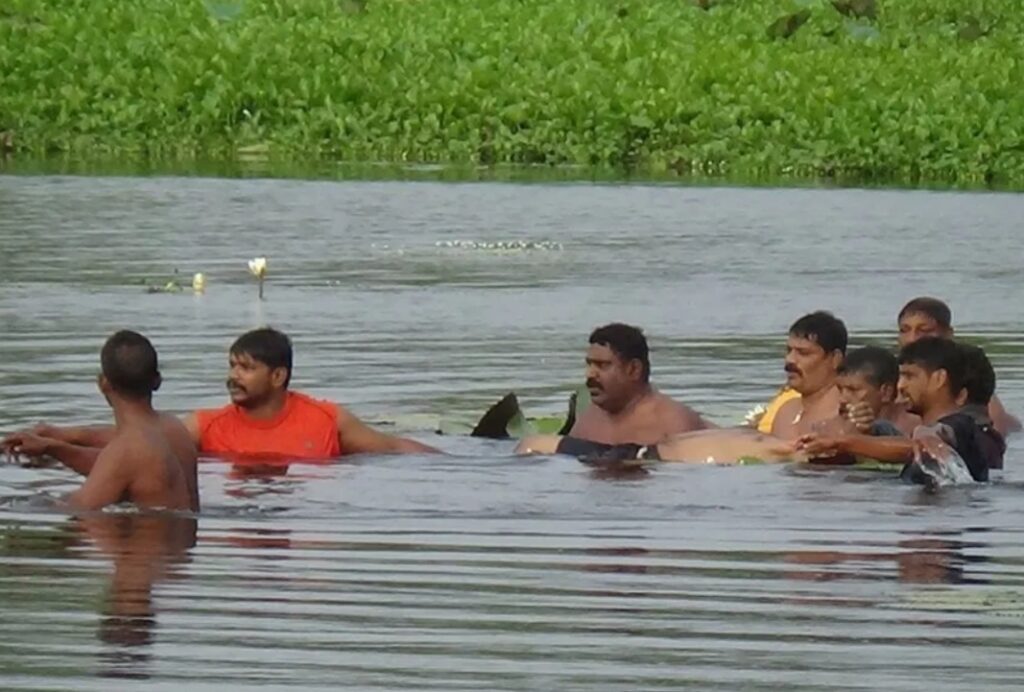 குறித்த ஆசிரியர் அந்தப் பகுதியில் உள்ள ஆலயத்தின் தேர்த் திருவிழாவுக்காக குளத்தில் தாமரைப்பூ பறிக்கச் சென்றுள்ளார்.