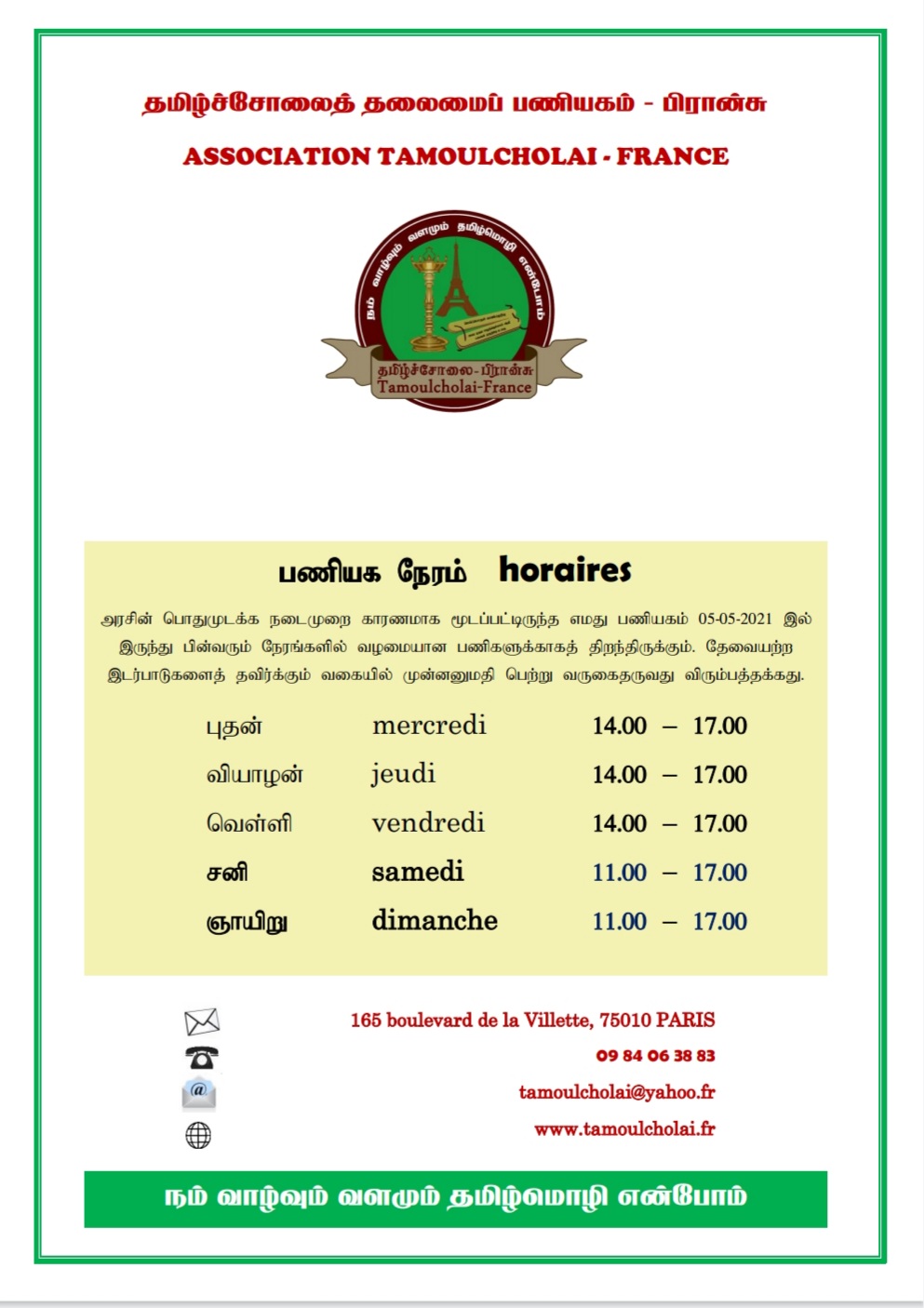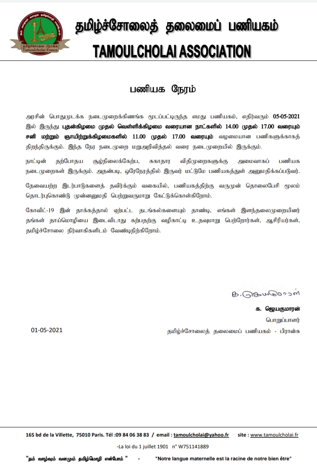 பிரான்சு அரசின் பொதுமுடக்க நடைமுறைக்கிணங்க மூடப்பட்டிருந்த எமது பணியகம், எதிர்வரும் 05-05-2021 இல் இருந்துபுதன்கிழமை முதல் வெள்ளிக்கிழமை வரையான நாட்களில் 14.00 முதல் 17.00 வரையும்சனி மற்றும் ஞாயிற்றுக்கிழமைகளில் 11.00 முதல் 17.00 வரையும் வழமையான பணிகளுக்காகத் திறந்திருக்கும்.