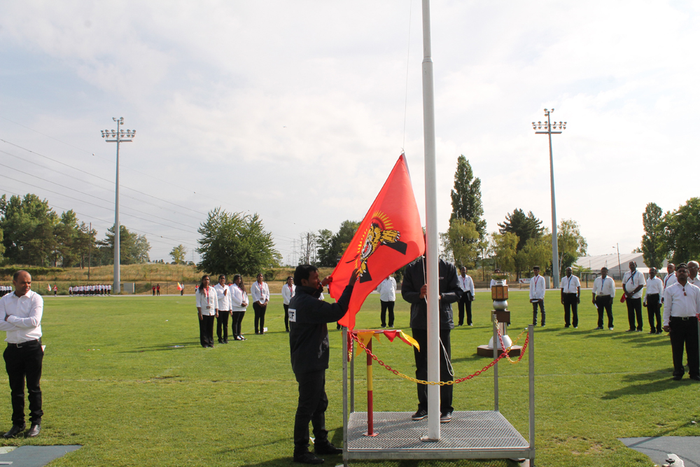 அகவணக்கத்தைத் தொடர்ந்து பிரெஞ்சுக் கொடியினை சார்சல் தமிழ்ச் சங்கத் தலைவர் திரு.டக்ளஸ் அவர்கள் ஏற்றிவைக்க, தமிழீழத் தேசியக்கொடியினை பிரான்சு தமிழர் விளையாட்டுத்துறைப் பொறுப்பாளர் அவர்கள் ஏற்றிவைத்தார்.