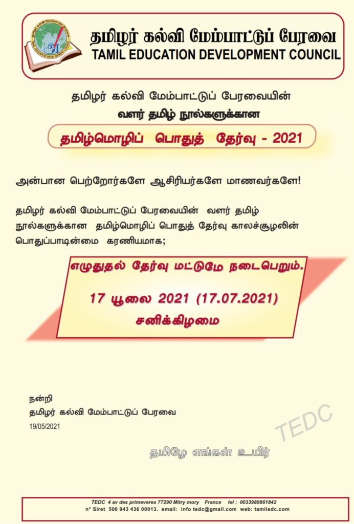 அது போலவே 2021ஆம் ஆண்டும் நுண்ணுயிரத் தாக்கம் தொடர்ந்தும் இருப்பதால் மாணவர்கள், ஆசிரியர்கள் பெற்றோர்கள் செயற்பாட்டாளர்கள் ஆகியோரின் பாதுகாப்புக் கருதி ( நலன்கருதி) தமிழ்மொழிப்; பொதுத் தேர்வு எழுதுதல் தேர்வு மட்டும் 17.07. 2021 அன்று நடைபெறும் என்பதை தமிழர் கல்வி மேம்பாட்டுப் பேரவை முடிவு செய்து பெரு மகிழ்ச்சியுடன் அறியத் தருகின்றது. தேர்வுக்கு அணியமாகும் மாணவர்கள் வழிகாட்டலாக தேர்வுத்தாள்கள் பெற கீழ் உள்ள