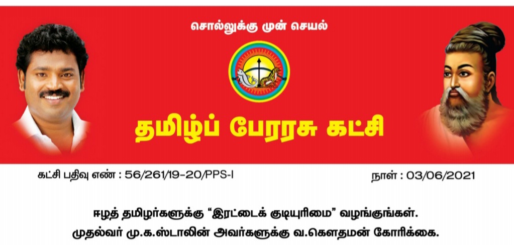 ஈழத் தமிழர்களுக்கு “இரட்டைக் குடியுரிமை” வழங்குங்கள் என்று தமிழக முதல்வர் மு.க.ஸ்டாலின் அவர்களுக்கு தமிழ்ப் பேரரசு கட்சியின் செயலாளர் வ.கௌதமன் கோரிக்கை விடுத்துள்ளார்.