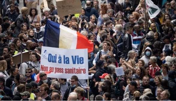 கத் தொடங்கி உள்ளன. இதனால் தடுப்பூசி பற்றிய ஐயங்களுக்குப் பதில் கிடைக்க முன்னரே பலரும் ஊசி ஏற்றிக்கொள்ள ஆரம்பித்துள்ளனர். அதிபர் மக்ரோனின் கட்டாய சுகாதாரப் பாஸ் திட்டத்தை எதிர்ப்போர் அதனை “சுகாதார சர்வாதிகாரம் (“health dictatorship”) என்று வர்ணிக்கின்றனர்.