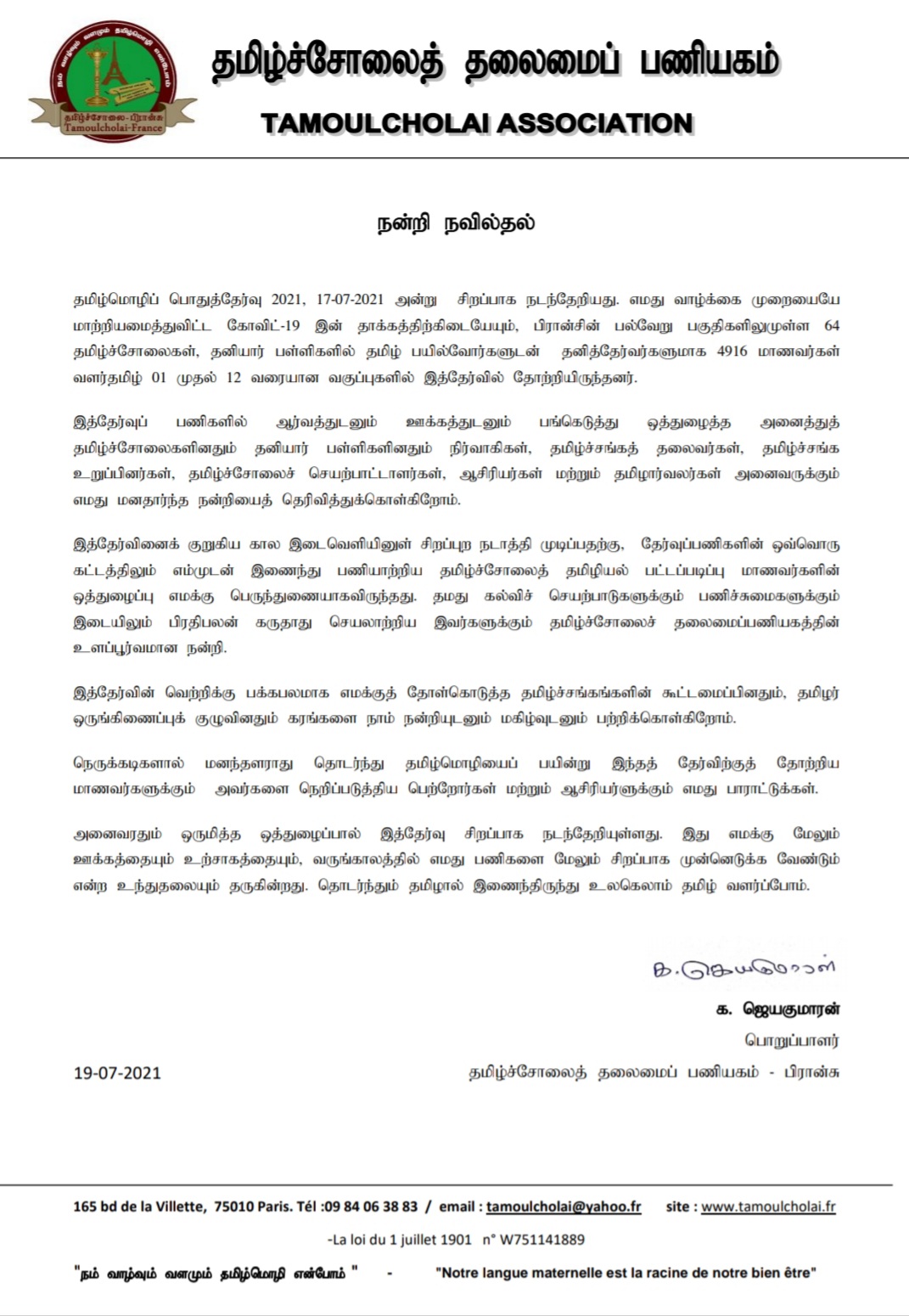 நெருக்கடிகளால் மனந்தளராது தொடர்ந்து தமிழ்மொழியைப் பயின்று இந்தத் தேர்விற்குத் தோற்றிய மாணவர்களுக்கும் அவர்களை நெறிப்படுத்திய பெற்றோர்கள் மற்றும் ஆசிரியர்ளுக்கும் எமது பாராட்டுக்கள். அனைவரதும் ஒருமித்த ஒத்துழைப்பால் இத்தேர்வு சிறப்பாக நடந்தேறியுள்ளது. இது எமக்கு மேலும் ஊக்கத்தையும் உற்சாகத்தையும், வருங்காலத்தில் எமது பணிகளை மேலும் சிறப்பாக முன்னெடுக்க வேண்டும் என்ற உந்துதலையும் தருகின்றது. தொடர்ந்தும் தமிழால் இணைந்திருந்து உலகெலாம் தமிழ் வளர்ப்போம்.