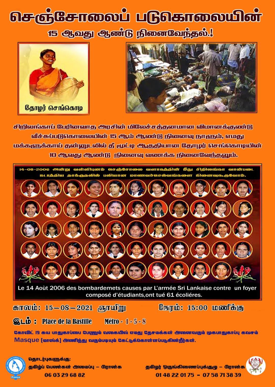 பிரான்சில் செஞ்சோலைப் படுகொலையின் 15 ஆம் ஆண்டு மற்றும் தோழர் செங்கொடி அவர்களின் நினைவு வணக்க நிகழ்வு நாளை 15.08.2021 ஞாயிற்றுக்கிழமை Place de la Bastille பகுதியில் பிற்பகல் 15.00 மணிக்கு பிரெஞ்சு அரசின் கோவிட் 19 சுகாதார சட்டவிதிகளுக்கு அமைவாக இடம்பெறவுள்ளது.
