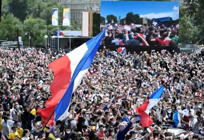 ப்பு விமானங்கள் (Patrouille de France) வானில் பறந்து தேசியக் கொடியின் மூவர்ணங்களை உமிழ்ந்தன. அதிபர் எமானுவல் மக்ரோன் சிறுவர்கள் இளம்