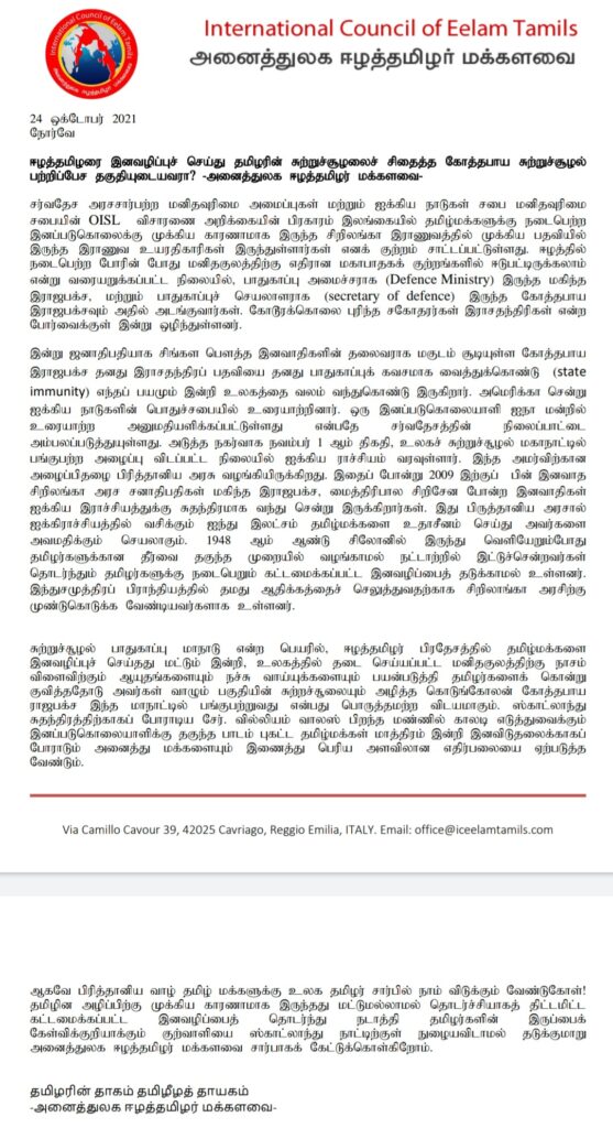 ஈழத்தமிழரை அழித்து சுற்றுச் சூழலை சிதைத்த கோத்தபாய சுற்றுச் சூழல் பற்றிப் பேசத் தகுதியுடையவரா என அனைத்துலக ஈழத்தமிழர் மக்களவை கேள்வி எழுப்பி அறிக்கை ஒன்றை வெளியிட்டுள்ளது. அதன் முழு வடிவம் வருமாறு:-