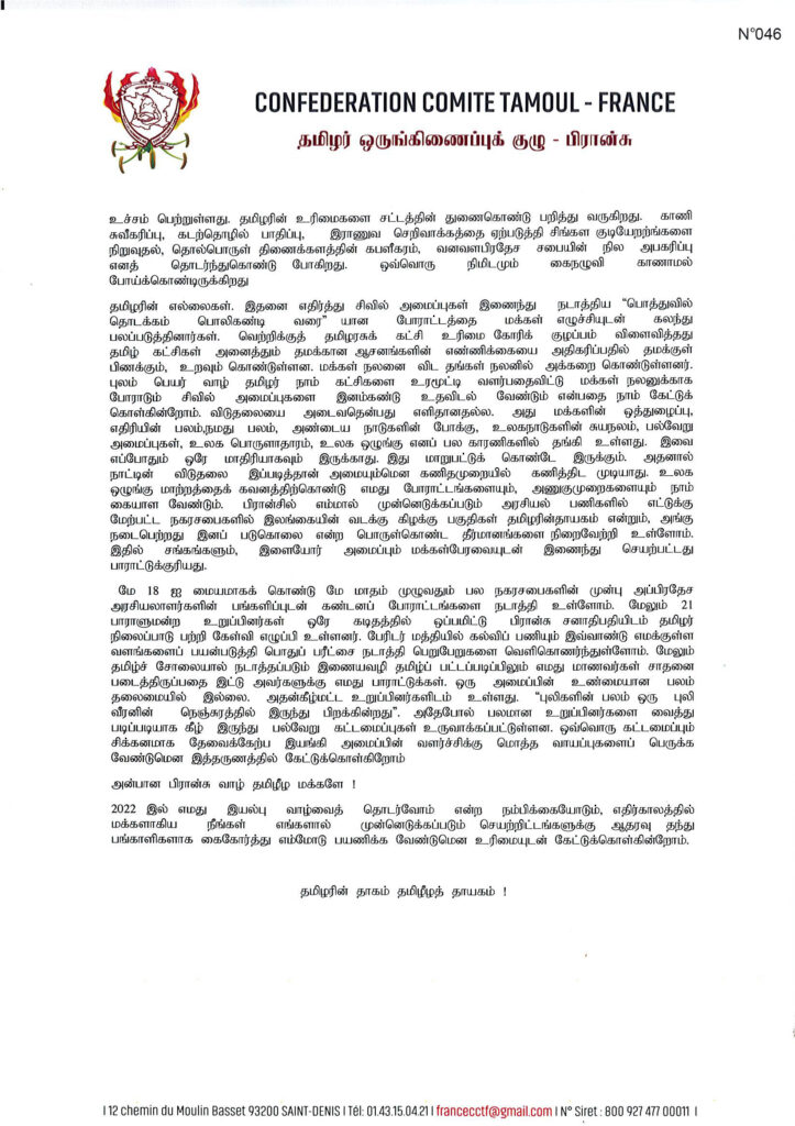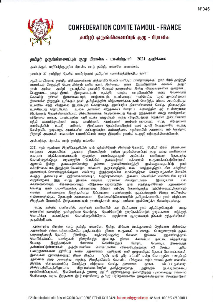 அன்புக்கும், மதிப்பிற்குமுரிய பிரான்சு வாழ் தமிழீழ மக்களே வணக்கம், நவம்பர் 27 தமிழீழத் தேசிய மாவீரர்நாள்! தமிழரின் வணக்கத்திற்குரிய நாள்!! ஆயிரமாயிரமாய் தமிழீழ விடுதலைக்காய் வித்தாகிப் போய் மிளிரும் மாவீரர்களுக்கு நாம் சிரம் தாழ்த்தி வணக்கம் செலுத்தி கௌரவிக்கும் புனித நாள். இன்றைய நாள் இழப்பிற்காகக் கலங்கி அழும் நாள் அல்ல. அன்றி துயரத்தில் துவண்டு போகும் நாளுமல்ல. இன்று வீரமறவர்களின் திருநாள்…. பெருநாள்…. நமது இனம், இறைமையுடன் சுதந்திர வாழ்வு வாழவேண்டும் என்ற வேணவாக் கொண்டு தங்கள் இளமையையும், வாழ்வையும், உயிரையும் ஈகம்செய்த மறப் புதல்வர்களை நினைவில் நிறுத்திப் பூசிக்கும் நாள். தமிழினத்தின் விடுதலைக்காக நாம் கொடுத்த விலை அளப்பரியது. உலகில் எந்த விடுதலை இயக்கமும் கொடுக்காத அளப்பரிய தியாகங்களைச் செய்து தியாகத்தின் உச்சியைத் தொட்டோம். உலக அரங்கில் விடுதலைப் போராட்ட வரலாற்றில் ஓர் உன்னதமான இடத்தைத் தேடிக்கொண்டோம். இம்மகோன்னத பெருமையைத் தேடித் தந்தவர்கள் எமது மாவீரர்களே. விடுதலை என்பது மானிடத்தின் அதி உச்ச விழுமியம். அந்த விழுமியத்தை நெஞ்சில் இலட்சியமாக ஏந்தி பயணித்தவர்கள் எமது மாவீரர்கள். அவர்களின் வாழ்வும் வரலாறும் எமது விடுதலைக் காவியத்தின் உயிர் வரிகள். இவர்களை நெய்விளக்கேற்றி மலர் தூவி வெறுமனவே கடந்து சென்றுவிட முடியாது. அவர்களின் அப்பழுக்கற்ற எண்ணத்தை, ஆன்மாவின் அவாவை எம் நெஞ்சில் நிறுத்தி அவர்கள் பாதையில் பயணிப்போம் என்று இப்புனித நாளில் உறுதி எடுத்துக்கொள்வோம். அன்பார்ந்த பிரான்சு வாழ் தமிழீழ மக்களே! 2021 ஆம் ஆண்டின் இறுதிப்பகுதியில் நாம் நிற்கின்றோம். இன்னும் கோவிட் பேரிடர் நீங்கி இயல்பான வாழ்வை அனுபவிக்க முடியாத நிலையிலும்; தமிழர் ஒருங்கிணைப்புக் குழு தமது பணிகளைச் சுகாதார விதிக்கமைவாகவும் குறைந்த வளங்களுடனும: அதிஉச்ச பணியைத் தொடர்ந்து கொண்டிருக்கிறது. வரலாற்றின் போக்கில் தலைவர்கள் மக்களால் உருவாக்கப்படுகிறார்கள். ஆனால், இன்று தலைவர்களென்று தம்மை முன்னிலைப்படுத்தி முன்வருவதையிட்டு; நாம் எச்சரிக்கையாக இருத்தல் வேண்டும் எம்மைக் குழப்புவதிலும், மடை மாற்றுவதிலும் சில சக்திகள் முனைப்புக் கொண்டிருக்கின்றன. எம்மோடு இருந்தவர்களே எமக்கெதிரான செயற்பாடுகளில் போலிக் கடிதத் தலைப்புடன் அறிக்கைகளையும், தெரிவுகளையும் இணைய வெளியில் எம்மிடையே பரப்பி வருகின்றனர். இது எமது இயக்க மரபுக்கு முரணான செயற்பாடாகும். இப்படியான பல சவால்களையும், சிக்கல்களையும் விடுதலை வரலாற்றில் நாம் சந்தித்துள்ளோம். அவைகளை வென்று நாம் பயணிப்பதற்கு மக்களாகிய நீங்கள் எம்மீது கொண்டிருந்த நம்பி