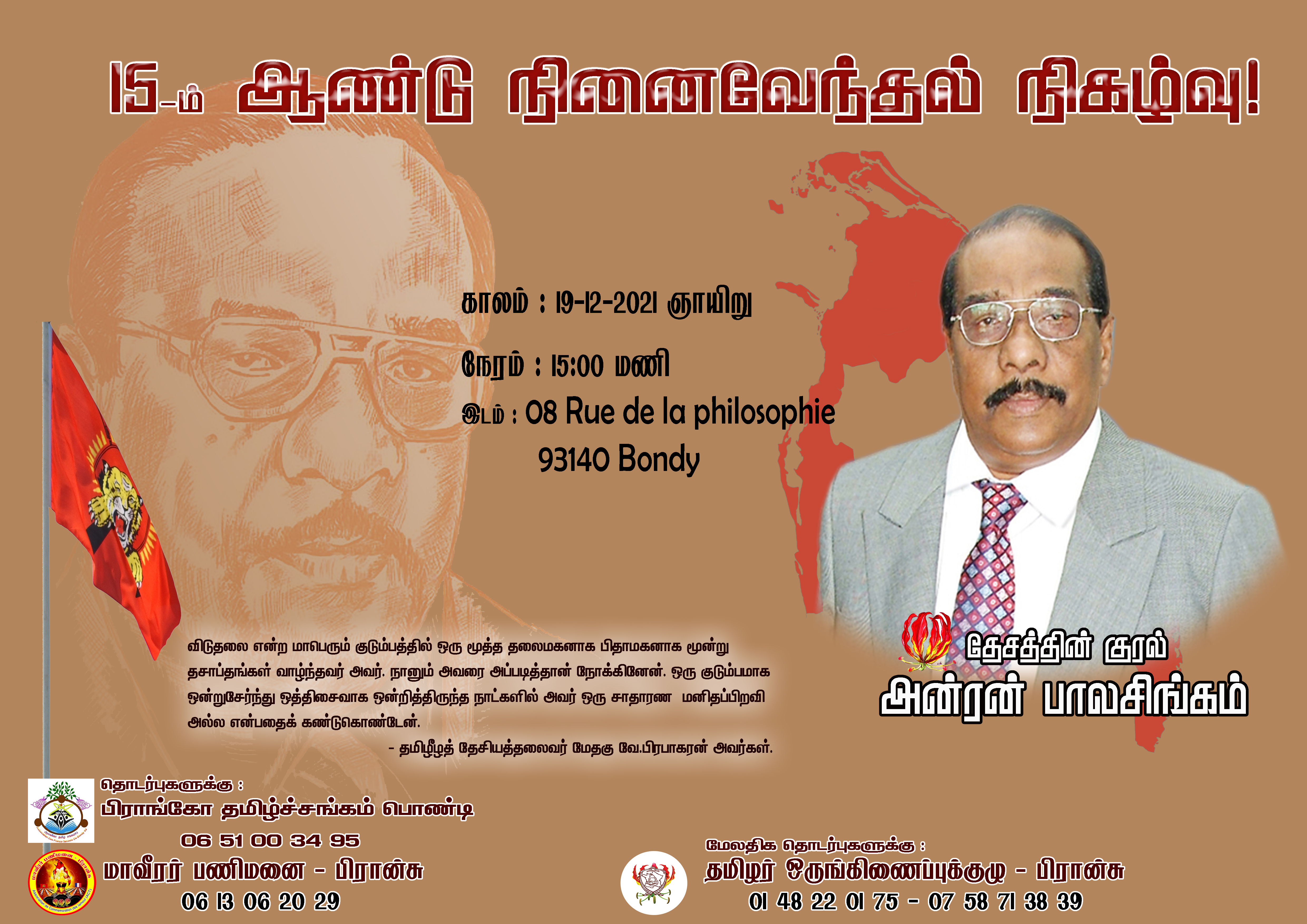 சிறப்பு செய்திகள்புலத்துச்செய்திகள் பிரான்சில் தேசத்தின் குரல் அன்ரன் பாலசிங்கம் அவர்களின் 15 ஆம் ஆண்டு நினைவேந்தல்! By Admin - December 14, 2021 0 687 தேசத்தின் குரல் அன்ரன் பாலசிங்கம் அவர்களின் 15 ஆம் ஆண்டு நினைவேந்தல் நிகழ்வு பிரான்சின் பொண்டிப் பகுதியில் எதிர்வரும் 19.12.2021 ஞாயிற்றுக்கிழமை பிற்பகல் 15.00 மணிக்கு பிரான்சு தமிழர் ஒருங்கிணைப்புக் குழுவின் ஏற்பாட்டில் இடம்பெறவுள்ளது.
