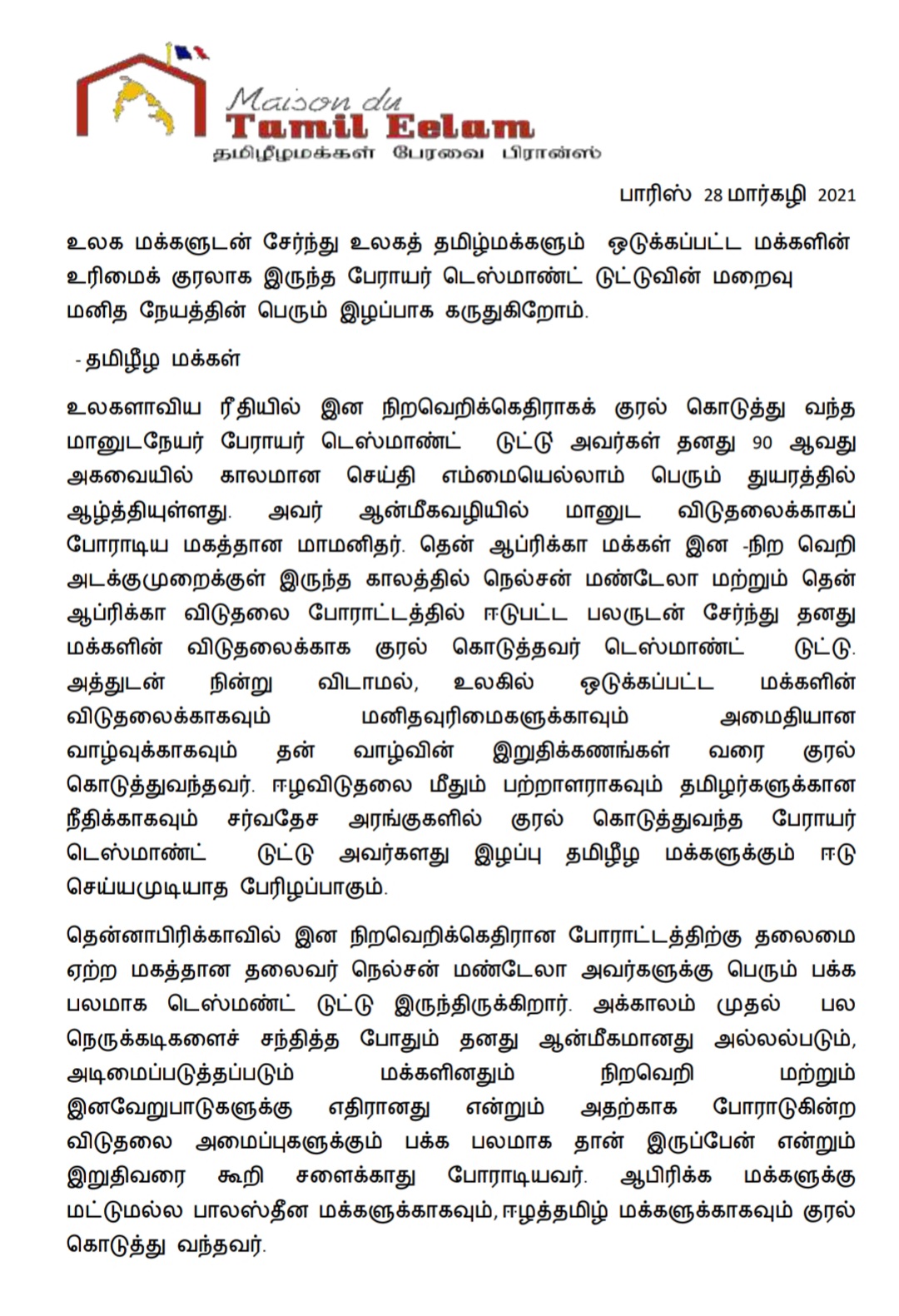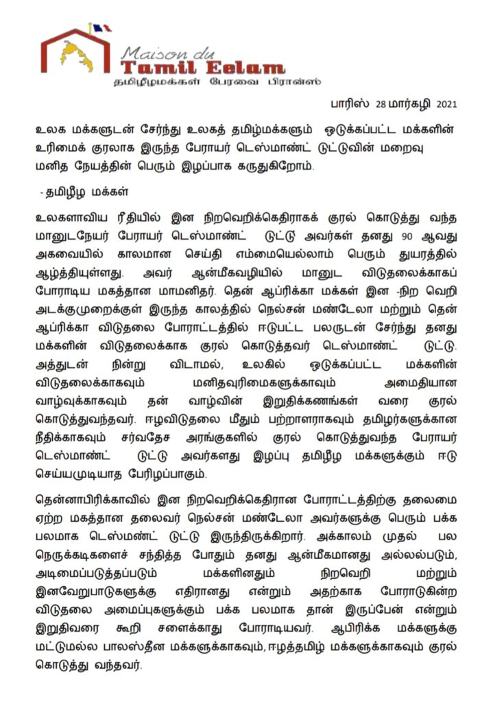 உலகளாவிய ரீதியில் இன நிறவெறிக்கெதிராகக் குரல் கொடுத்து வந்த மானுடநேயர் பேராயர் டெஸ்மாண்ட் டுட்டு் அவர்கள் தனது 90 ஆவது அகவையில் காலமான செய்தி எம்மையெல்லாம் பெரும் துயரத்தில் ஆழ்த்தியுள்ளது. அவர் ஆன்மீகவழியில் மானுட விடுதலைக்காகப் போராடிய மகத்தான மாமனிதர். தென் ஆப்ரிக்கா மக்கள் இன -நிற வெறி அடக்குமுறைக்குள் இருந்த காலத்தில் நெல்சன் மண்டேலா மற்றும் தென் ஆப்ரிக்கா விடுதலை போராட்டத்தில் ஈடுபட்ட பலருடன் சேர்ந்து தனது மக்களின் விடுதலைக்காக குரல் கொடுத்தவர் டெஸ்மாண்ட் டுட்டு. அத்துடன் நின்று விடாமல், உலகில் ஒடுக்கப்பட்ட மக்களின் விடுதலைக்காகவும் மனிதவுரிமைகளுக்காவும் அமைதியான வாழ்வுக்காகவும் தன் வாழ்வின் இறுதிக்கணங்கள் வரை குரல் கொடுத்துவந்தவர். ஈழவிடுதலை மீதும் பற்றாளராகவும் தமிழர்களுக்கான நீதிக்காகவும் சர்வதேச அரங்குகளில் குரல் கொடுத்துவந்த பேராயர் டெஸ்மாண்ட் டுட்டு அவர்களது இழப்பு தமிழீழ மக்களுக்கும் ஈடு செய்யமுடியாத பேரிழப்பாகும்.