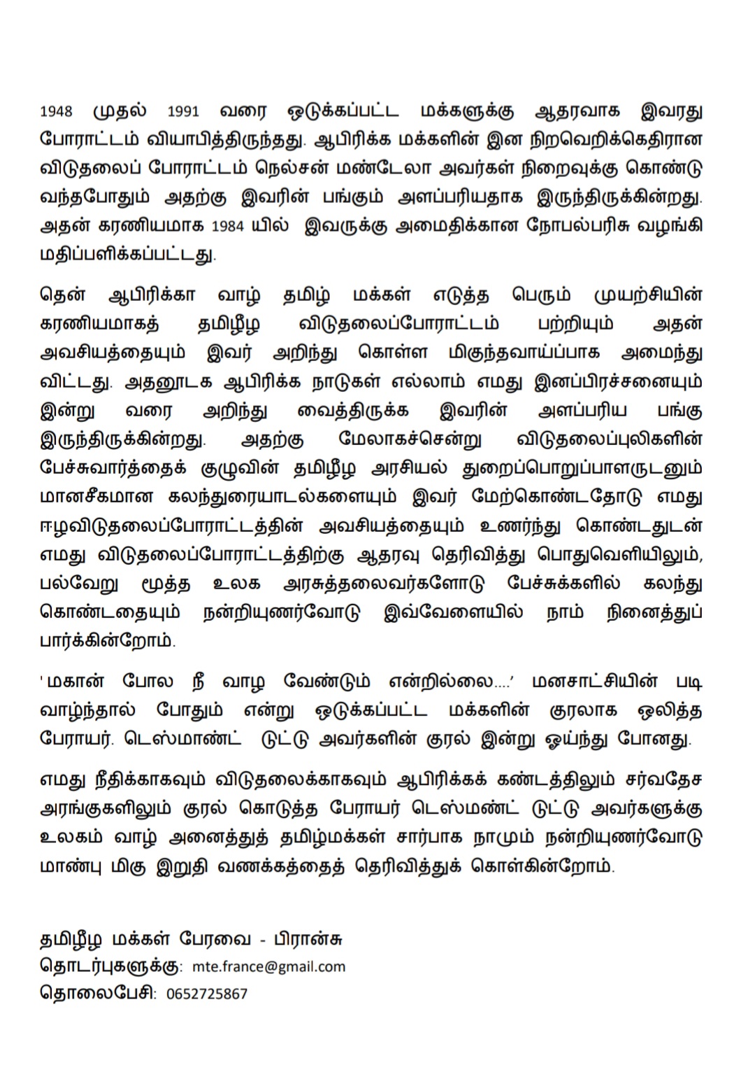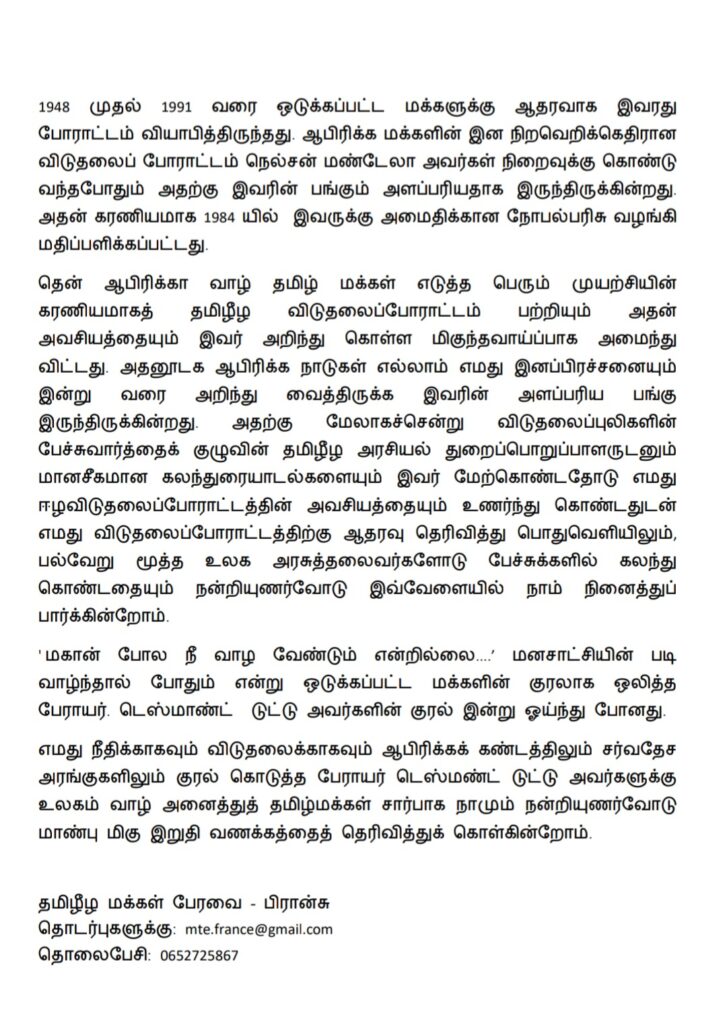 உலக மக்களுடன் சேர்ந்து உலகத் தமிழ்மக்களும் ஒடுக்கப்பட்ட மக்களின் உரிமைக் குரலாக இருந்த பேராயர் டெஸ்மாண்ட் டுட்டுவின் மறைவு மனித நேயத்தின் பெரும் இழப்பாக கருதுகிறோம்.