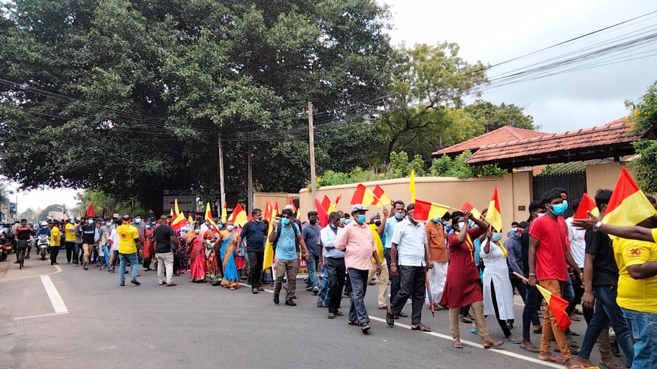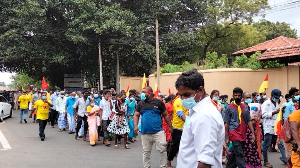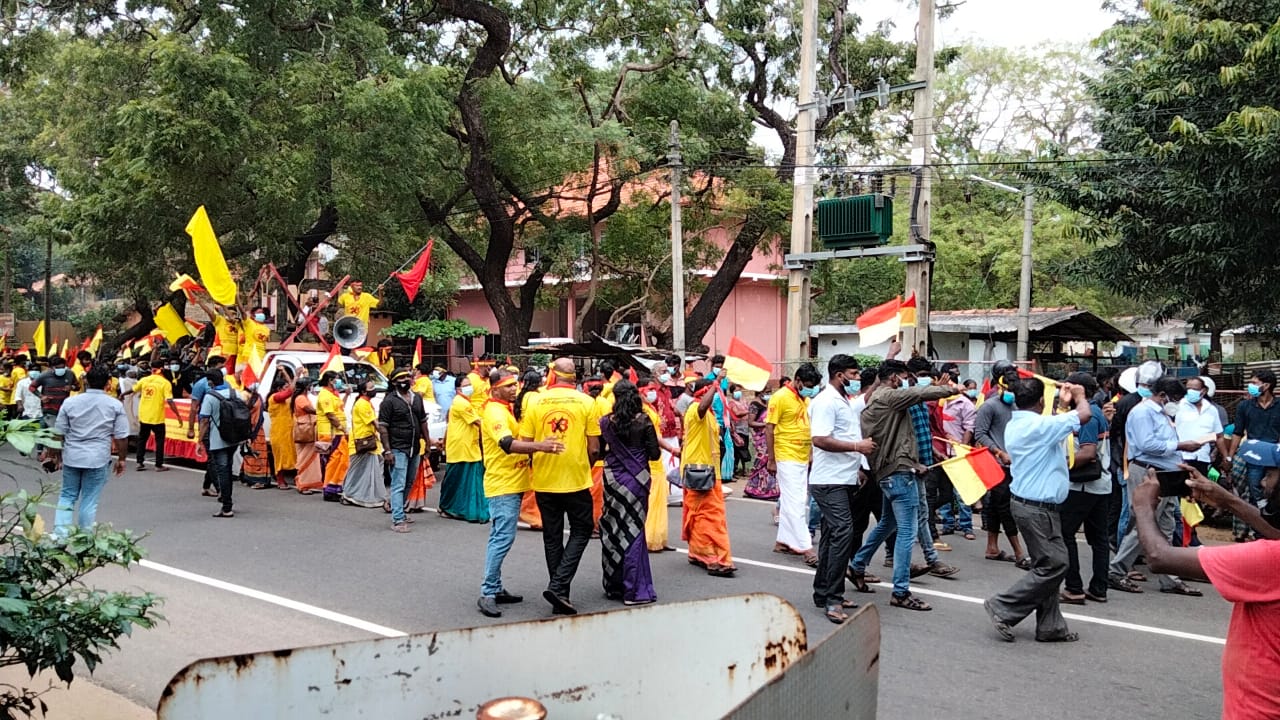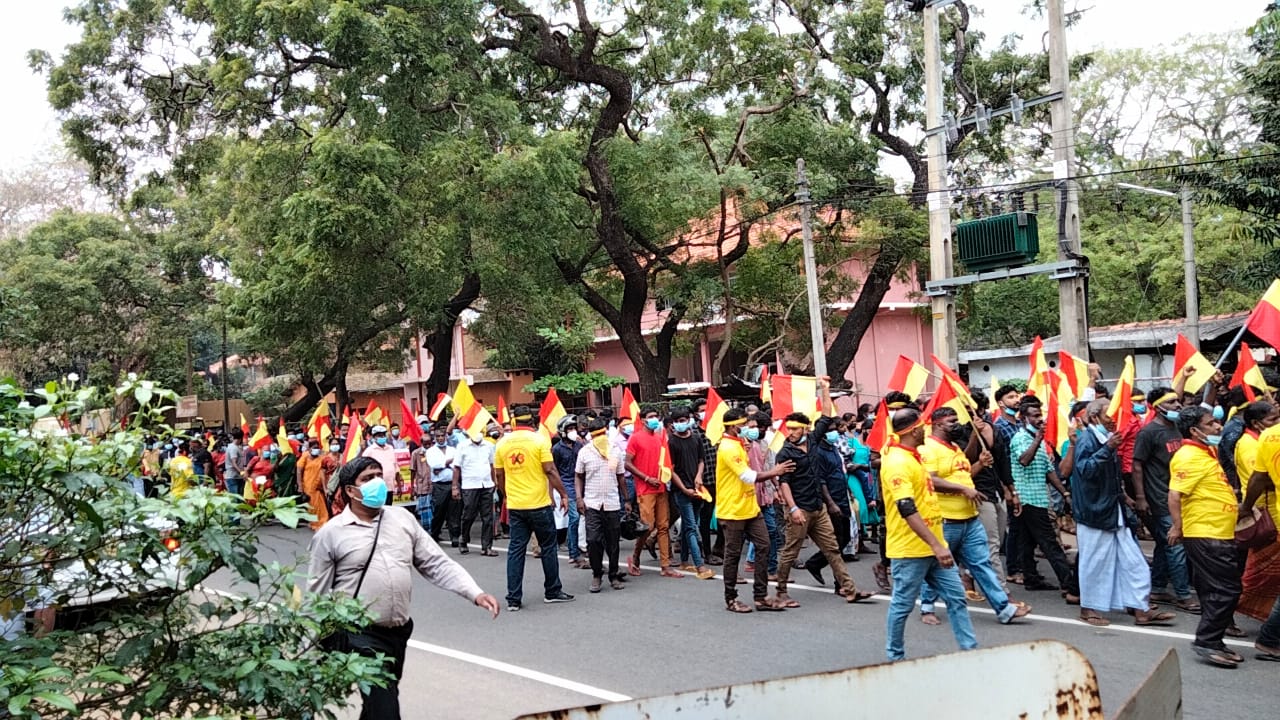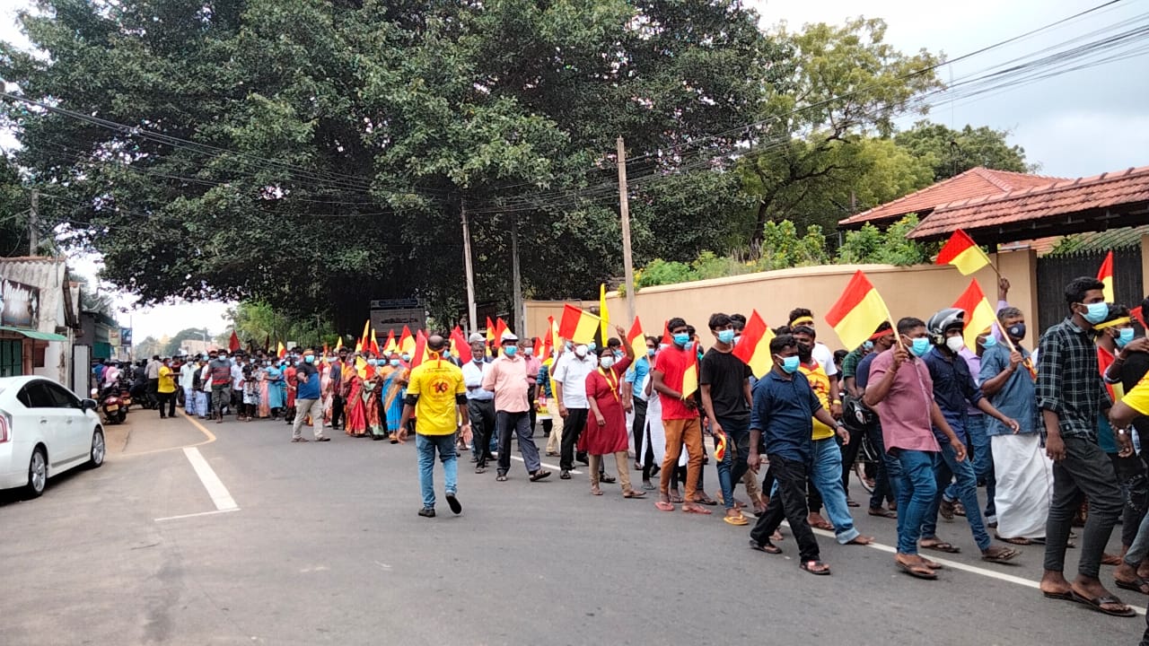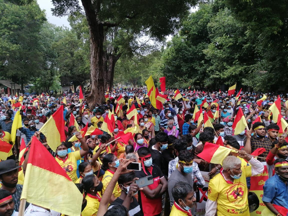 13ஐ உடைத்தெறிய கொட்டும் மழையிலும் இன்று யாழில் அணிதிரண்ட தமிழர்களின் குறித்த போராட்டத்தின் தொடக்கத்தில் மழைவடிவல் தியாக தீபம் திலீபன் அண்ணாவின் ஆசியுடன் தொடங்கியது போராட்டம் குறித்த போராட்டத்தில் தியாக தீபம் திலீபன் அண்ணா கூறிய மக்கள் புரட்சி வெடிக்கட்டும் என்ற சிந்தனைக்கு செயல்வடிவம் கொடுத்து தமிழர் படை தங்களின் உரிமைகான போராட்டத்தை நடத்திக்கொண்டு கிட்டு பூங்காவிற்கு சென்றதும் வடக்கும் கிழக்கும் தமிழர் தாயகம் தமிழர் என்று சொல்லடா தலை நிமிர்ந்து நில்லடா என்று தாயகம் விடுதலை நோக்கிய கோசங்கள் இடிமுழக்கமாக முழங்கியுள்ளனர்.