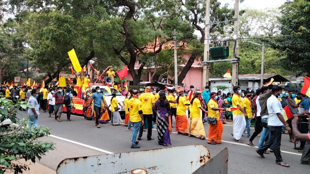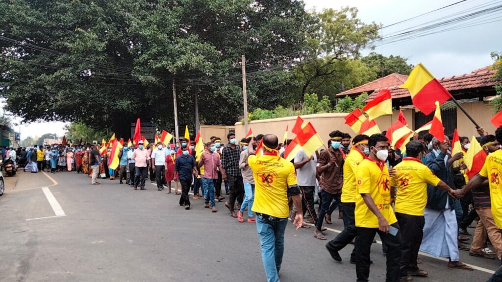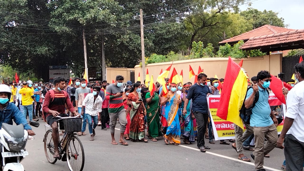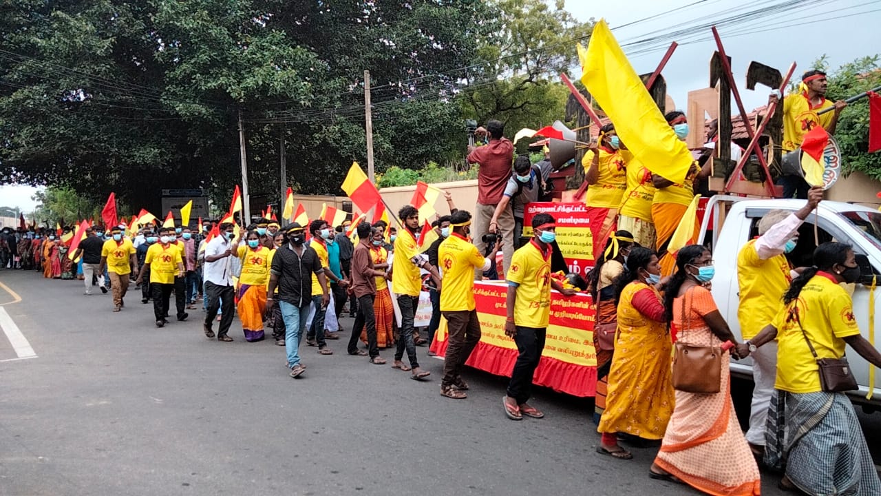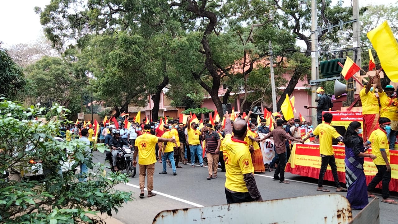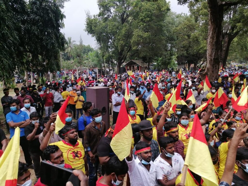 13ஐ உடைத்தெறிய கொட்டும் மழையிலும் இன்று யாழில் அணிதிரண்ட தமிழர்களின் குறித்த போராட்டத்தின் தொடக்கத்தில் மழைவடிவல் தியாக தீபம் திலீபன் அண்ணாவின் ஆசியுடன் தொடங்கியது போராட்டம் குறித்த போராட்டத்தில் தியாக தீபம் திலீபன் அண்ணா கூறிய மக்கள் புரட்சி வெடிக்கட்டும் என்ற சிந்தனைக்கு செயல்வடிவம் கொடுத்து தமிழர் படை தங்களின் உரிமைகான போராட்டத்தை நடத்திக்கொண்டு கிட்டு பூங்காவிற்கு சென்றதும் வடக்கும் கிழக்கும் தமிழர் தாயகம் தமிழர் என்று சொல்லடா தலை நிமிர்ந்து நில்லடா என்று தாயகம் விடுதலை நோக்கிய கோசங்கள் இடிமுழக்கமாக முழங்கியுள்ளனர்.