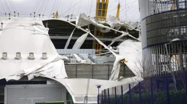தின்(O2 Arena) கூரையின் ஒருபகுதியை புயல் பிய்த்தெறிந்திருக்கிறது.