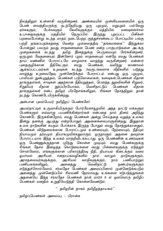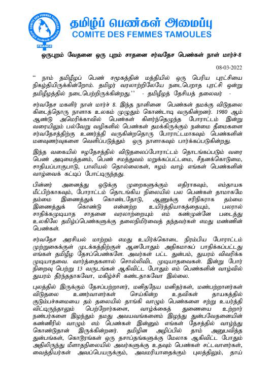 சிறப்பு செய்திகள் சர்வதேச மகளிர் தினத்தை முன்னிட்டு (மார்ச் 8) தமிழ்ப் பெண்கள் அமைப்பு-பிரான்சு விடுக்கும் செய்தி! By Admin - March 9, 2022 0 182
