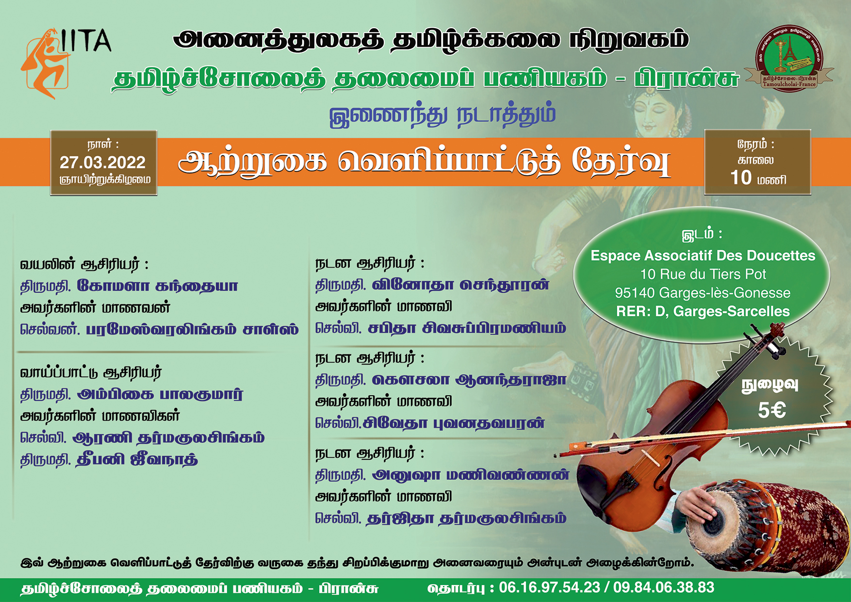 அனைத்துலகத் தமிழ்க்கலை நிறுவகமும், தமிழ்ச்சோலைத் தலைமைப்பணியகம்-பிரான்சும், இணைந்து நடாத்தும் ஆற்றுகை வெளிப்பாட்டுத் தேர்வு. எதிர் வரும் ஞாயிற்றுக்கிழமை ( 27-03-2022 ) அன்று பிரான்சு சார்சல் பகுதியில் நடைபெற உள்ளது. இந்த ஆற்றுகை வெளிப்பாட்டுத் தேர்வுக்கு வருகை தந்து சிறப்பிக்குமாறு அனைவரையும் அன்புடன் அழைக்கின்றனர்.