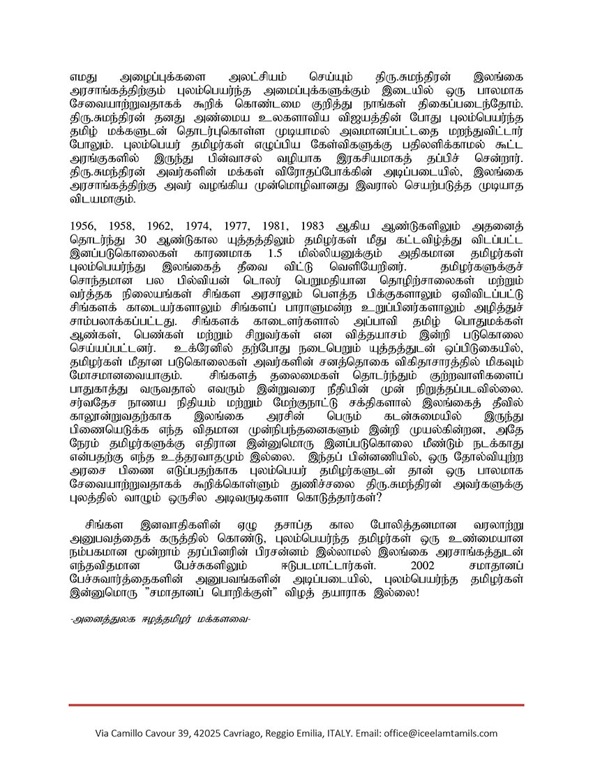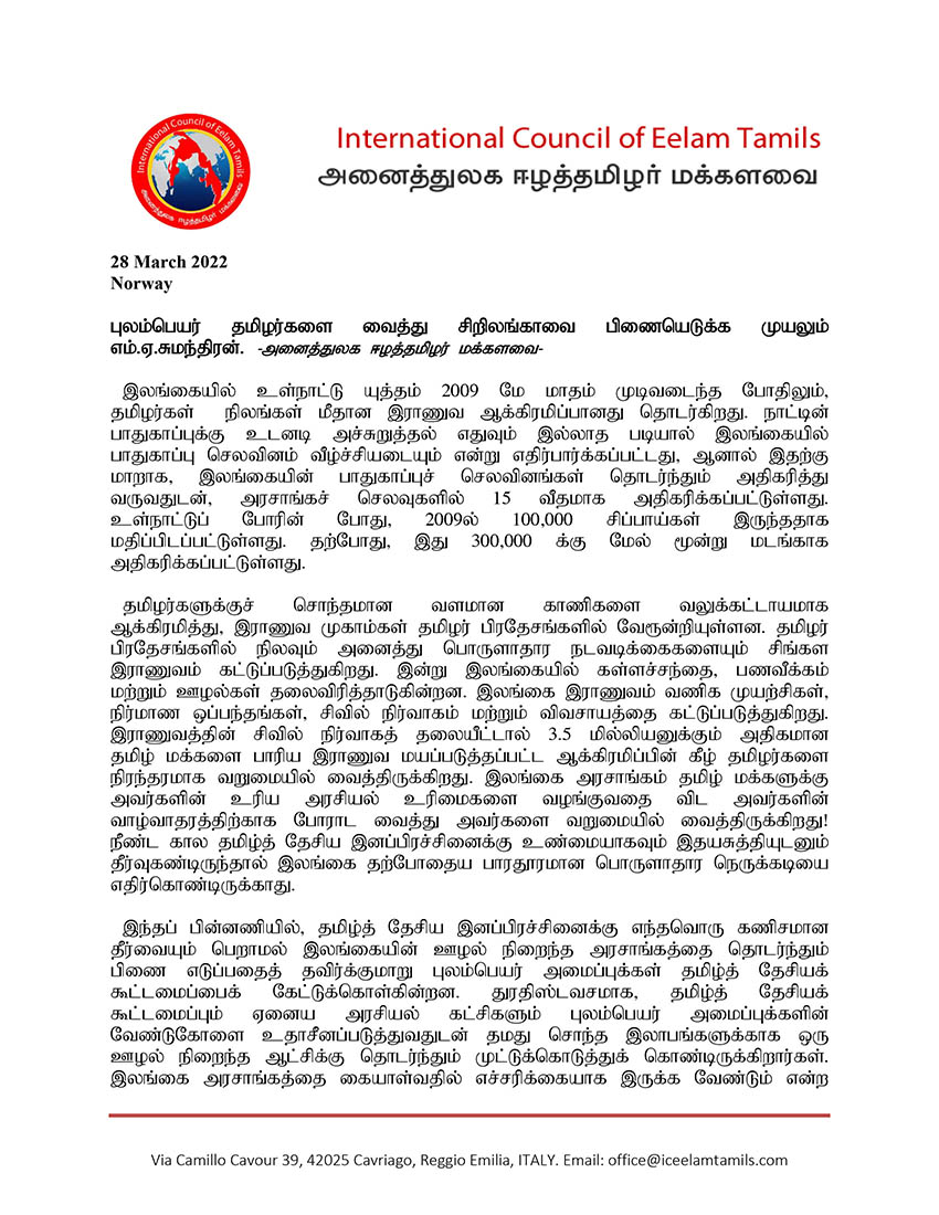 சிறப்பு செய்திகள்புலத்துச்செய்திகள் புலம்பெயர் தமிழர்களை வைத்து சிறிலங்காவைப் பிணையெடுக்க முனையும் எம்.ஏ சுமந்திரன்! By Admin - March 30, 2022 0 172 சிறிலங்காவில் தற்போது இடம்பெற்றுவரும் பொருளாதார மற்றும் அரசியல் நெருக்கடி நிலைப்பாடுகள் குறித்து அனைத்துலக ஈழத்தமிழர் மக்களவை அறிக்கை ஒன்றினை வெளியிட்டுள்ளது. குறித்த அறிக்கையின் முழுவடிவம் கீழே இணைக்கப்பட்டுள்ளது.