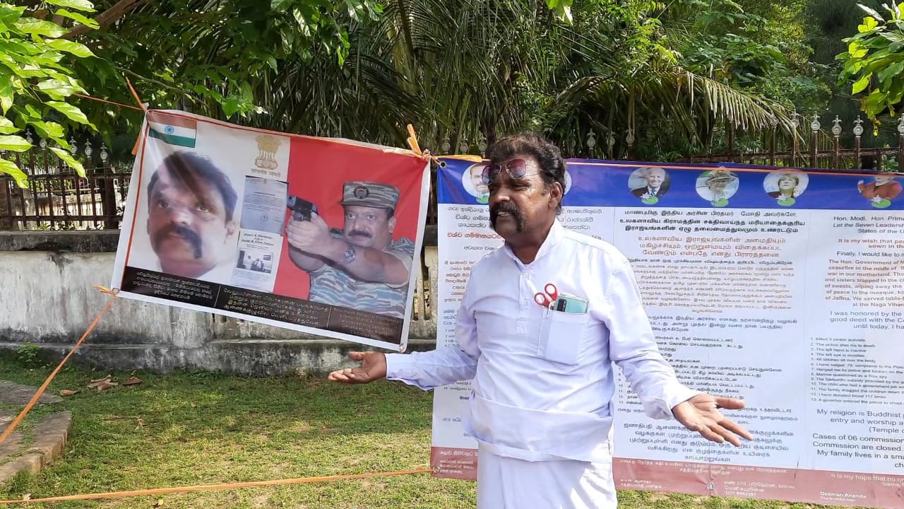 குறித்த நபர் தமிழீழத் தேசியத் தலைவர் மேதகு வேலுப்பிள்ளை பிரபாகரன் அவர்களின் புகைப்படத்தை காட்சிப்படுத்தி போராட்டத்தில் ஈடுபட்டுள்ளார்.
