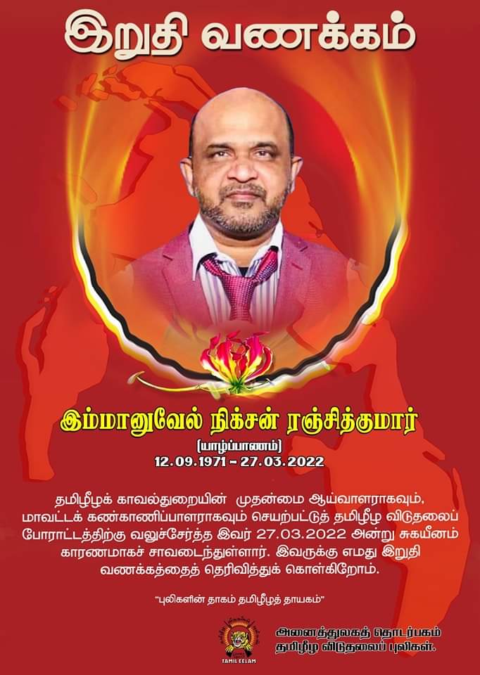 தமிழீழக் காவல்துறையில் ஒரு முதன்மை ஆய்வாளராகவும் முல்லைத்தீவு மாவட்ட கண்காணிப்பாளராகவும் பணியாற்றி முள்ளிவாய்க்கால் இறுதி யுத்தம்வரை தமிழீழ மக்களோடு மக்களாக நின்று தமிழீழக் காவல்துறையின் பொறுப்பதிகாரியாகவும் கடமையாற்றி இனவழிப்பின் சாட்சியமாகவும் இருந்துவந்த திரு. இம்மானுவல் நிக்சன் ரஞ்சித்குமார் (வயது 51) அவர்கள் பிரான்சில் கடந்த (27. 03. 2022) ஞாயிற்றுக்கிழமை இதய சத்திர சிகிச்சையின் பின்னர் ஏற்பட்ட உடல்நலக்குறைவால் சாவடைந்திருந்தமை குறிப்பிடத்தக்கது.